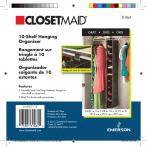 31464 GRAY•GRIS•GRIS 10-Shelf Hanging Organizer Rangement sur tringle à 10 tablettes Organizador colgante de 10 estantes Hangs on wire or wood rod Features • Versatile hook and loop fastener, hangs on wire shelf or closet rod • Ideal for shoes and accessories 01-87071-12 Products of China Produits de la Chine Productos de China 54.02 in. H x 5.98 in. W x 12.01 in. D 137,2 cm x 15,2 cm x 30,5 cm © 2015 ClosetMaid Corporation Ocala, FL 34471 1-800-874-0008 (USA, Canada) www.closetmaid.com 31464 Hanging Org 10-Shelf GRY CC (01-87071-12) rev.indd 1 12/18/14 6:41 AM Note: Some products have two attachments. Repeat instructions for both attachments. To hang on rod To hang on wire Manufacturer reserves the right to change specifications without notice. Le fabricant se réserve le droit d’apporter des c hangements aux caractéristiques sans préavis. El fabricante se reserva el derecho de modificar las especificaciones sin previo aviso. 31464 Hanging Org 10-Shelf GRY CC (01-87071-12) rev.indd 2 12/18/14 6:41 AM ">