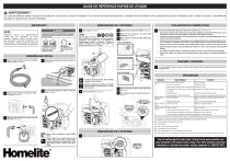 GUIDE DE RÉFÉRENCE RAPIDE DE UT40520 AVERTISSEMENT : Ce guide de référence rapide n’est pas une substitution à la lecture du manuel d’utilisation. Pour réduire les risques de blessures, l’utilisateur doit lire et veiller à bien comprendre le manuel d’utilisation avant d’utiliser ce produit. Les références de page se rapportent au manuel d’utilisation. IMPORTANT ! DÉMARRAGE DE L’APPAREIL 1 AVIS : Respectez toujours les règlementations locales lors de l’évacuation de l’eau pompée. Certaines régions peuvent avoir des restrictions concernant l’évacuation de l’eau pompée. Vérifiez auprès des autorités concernées avant d’utiliser cette eau pompée. L’utilisation d’une pompe à eau à gaz à l’intérieur PEUT VOUS TUER ENQUELQUES MINUTES. Les moteurs produisent du monoxyde de carbone, un gaz mortel incolore et inodore. Utilisez longueur de tuyau suffisante pour maintenir la pompe d'au moins 6 mètres (20 pieds) loin de toutes les fenêtres, portes et évents. Dirigez échappement loin de toutes les fenêtres, portes et évents. NE JAMAIS utiliser à l’intérieur d’une maison ou d’un garage, MÊME SI les portes et les fenêtres sont ouvertes. Utiliser uniquement À L’EXTÉRIEUR et loin des fenêtres, des portes et des évents. Ajout d’essence (voir page 12). AVIS : Ne pas utiliser d’essence E15 ou E85 dans ce produit. Une telle utilisation représente une violation de la loi fédérale et endommagera l’appareil et annulera la garantie. Utiliser seulement de l’essence sans plomb ne contenant pas plus de 10 % d’éthanol. 1 4 3 Déplacez le levier d’accélération à DROITE (voir page 13). 4 Mettre le levier d’étrangleur à la position START (démarrage) (voir page 13). 5 Mettre le levier de carburant en position OPEN (ouvrir) (voir page 13). 1 Suivez toutes les instructions et règles lors de l’utilisation de la pompe à eau (voir les pages 3 à 5). • Ne pas démarrer ou faire tourner le moteur dans un espace confine, de bâtiment, à proximité des fenêtres ouverts, autre ou des zones sans ventilation où des vapeurs toxiques de monoxyde de carbone peuvent s’accumuler. • N,utilisez pas ce produit pour pomper de l’acide, des produits alcalins, des solvants, des substances inflammables, de l’eau de Javel ou des solutions industrielles. • Sécurisez la pompe afin de réduire le risque de blessures ou de dommages matériels dus à un mouvement imprévu de l’outil. En cas d’inclinaison ou de déplacement de la machine, arrêtez l’opération et ancrer la pompe pour éviter tout mouvement. LEVIER D’ACCÉLÉRATEUR • N’utilisez pas la pompe avant d’avoir attaché un tuyau d’aspiration doté d’un filtre et de l’avoir connecté à une source d’eau. • Sécurisez le tuyau d’évacuation. Un tuyau non sécurisé peut s’arracher ou « reculer » lors de l’opération et causer de graves blessures. • Pour obtenir une aspiration maximale, la distance entre la pompe et la source d’eau doit être aussi courte que possible. • Évitez d’utiliser l’appareil à des vitesses lentes ou élevées pendant de longues périodes, car cela pourrait endommager la pompe. ASSEMBLAGE INITIAL Attachez le tuyau d’aspiration (non fourni) à la crépine à l’aide d’un collier (voir page 10). UTILISATION DU POMPE D’EAU LEVIER DE VOLET DE DÉPART Connectez le tuyau d’aspiration (non fourni) à la source d’eau (voir page 11). RANGER L’APPAREIL 1 Lors de la préparation du pompe d’eau pour le remisage, laisser l’appareil refroidir complètement puis suivre les instructions à les pages 15 et 16. LEVIER DE CARBURANT DÉPANNAGE Ce moteur est un moteur 4 temps. Ne pas mélanger d’essence et d’huile ensemble. Mélanger le stabilisateur de carburant et le carburant selon les directives du fabricant avant de le verser dans le réservoir. 5 2 Attachez le tuyau d’aspiration (non fourni) sur l’entrée de la pompe (voir page 10). Ajout d’une pleine bouteille de lubrifiant fournie dans l’unité (voir page 12). 2 Amorcez la pompe à eau (voir page 13). PROBLÈME CAUSE POSSIBLE Le moteur ne démarre Pas de carburant dans le réservoir pas Falló o tiene corto la bujía 6 Régler le commutateur de moteur en position ON (marche) (voir page 13). 7 Tirer le poignée du lanceur et corde pour démarrer (voir page 13). COMMUTATEUR DE MOTEUR EN LA POSITION « ON » (MARCHE) TIRER LE LE POIGNÉE DU LANCEUR ET CORDE POUR DÉMARRER SOLUTION Remplir le réservoir Remplacer la bougie Bougie cassée (porcelaine fendue ou électrode brisé) Remplacer la bougie Fil d’allumage court-circuité, brisé ou déconnecté Remplacer le fil d’allumage ou le brancher sur la bougie de la bougie Moteur difficile à démarrer Allumage inopérant Contacter un centre de réparations agréé Levier d’étrangleur en position RUN (marche) Mettre le volet de départ en position de START (démarrage) Eau dans le carburant Vidanger l’ensemble du système et remplir de carburant frais. Étincelle de bougie faible Contacter un centre de réparations agréé. Moteur difficile à Le filtre à air est sale lancer Nettoyer ou remplacer le filtre à air Sortie inférieure à la Fuites aux raccords normale Levier d’accélération déplacé vers la droite Serrez les raccords. Tuyau d’aspiration endommagé ou ayant des fuites Déplacez le levier d’accélération vers la gauche. Remplacez le tuyau d’aspiration. Tuyau d’évacuation endommagé ou ayant des fuites Remplacez le tuyau d’évacuation. 3 Si le problème persiste après avoir essayé les solutions ci-dessus, contacter le centre de réparations agréé le plus proche pour obtenir de l’aide. Attachez le tuyau d’évacuation (non fourni) sur la sortie de la pompe (voir page 11). Les symptômes suivants peuvent indiquer des problèmes affectant le niveau d’émissions de l’unité : Démarrage difficile ou calage après le démarrage Ralenti irrégulier Ratés ou ret