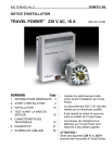 400 70 69-00, rév. 2 DOMETIC AB NOTICE D'INSTALLATION TRAVEL POWER® 230 V AC, 16 A SOMMAIRE Page (991 00 10-06) - Veuillez lire attentivement cette notice avant l'installation de Travel Power. 1. INFORMATIONS GÉNÉRALES 3 2. AVANT L'INSTALLATION 4 3. INSTALLATION 10 - 4. TEST AVANT LA MISE EN SERVICE Le raccordement 230 V AC doit être réalisé par un électricien qualifié. 18 - 5. CARACTÉRISTIQUES TECHNIQUES Il est interdit de retirer le recouvrement du boîtier de Travel Power. 19 - 6. DIAGNOSTIC 21 Les travaux de maintenance à effectuer sur Travel Power sont réservés à des ateliers agréés. 7. SCHÉMA DE CÂBLAGE 26 ATTENTION ! Seuls des appareils 220 V ou 230 V peuvent être raccordés à Travel Power. FRANÇAIS Notice d'installation REMARQUE: L'utilisation de Travel Power pour l'exploitation d'appareils de survie est interdite. La notice de montage s'adresse au personnel qualifié réalisant le montage et au personnel de maintenance de Travel Power®. REMARQUE: L'utilisation de cette notice d'installation suppose l'autorisation requise ainsi que les connaissances nécessaires pour la mise en exploitation de Travel Power®. Respectez les instructions décrites avant et pendant l'installation de Travel Power®. Utilisez également cette notice pour le diagnostic. Conservez cette notice afin de pouvoir la consulter ultérieurement. Sommaire Page 1. INFORMATIONS GÉNÉRALES 3 2. AVANT L'INSTALLATION 4 3. INSTALLATION 10 4. TEST AVANT LA MISE EN SERVICE 18 5. CARACTÉRISTIQUES TECHNIQUES 19 6. DIAGNOSTIC 21 7. SCHÉMA DE CÂBLAGE 26 1 INFORMATIONS GÉNÉRALES 1.1 CONSIGNES DE SÉCURITÉ La tension de sortie du générateur Travel Power est bien plus importante que celle d'une génératrice électrique. ATTENTION! Des raccordements supplémentaires de tout type ne doivent en aucun cas être effectués sur le générateur Travel Power. Le système Travel Power ne doit jamais entrer en contact avec l'alimentation en tension externe de 230 V ou le système 12/24 V du véhicule. Au cas où une alimentation supplémentaire de 230 V serait nécessaire pour le véhicule, un disjoncteur à 3 étages bipolaire doit obligatoirement être installé entre l'alimentation externe et le système Travel Power, comme décrit dans cette notice. Pour réaliser des travaux hors du véhicule, des rallonges spécialement adaptées à ce type de travaux présentant une section de 2,5 mm² et une longueur maximum de 100 m doivent être utilisées. Remarque: si l'interrupteur marche/arrêt se trouve en position MARCHE lorsque le moteur du véhicule est démarré, Travel Power est immédiatement démarré et fournit 230 V à la prise de courant. Assurezvous que tous les appareils ne devant pas être nécessairement utilisés sont éteints ou débranchés. 1.2 COMPOSANTS TRAVEL POWER Travel Power comprend les 3 composants principaux suivants: A) Générateur B) Boîtier électronique C) Câble blindé entre le générateur et le boîtier électronique. Ces 3 composants ne doivent pas et ne peuvent pas être utilisés indépendamment les uns des autres. Respectez à ce sujet les consignes relatives à l'installation dans cette notice. 1.3 PUISSANCE Travel Power fournit une tension alternative de 230 V et un facteur de puissance active de 50 Hz. Selon le régime du moteur, Travel Power fournit jusqu'à 16 A de puissance permanente. Contrairement à la puissance de sortie, la fréquence est indépendante du régime du moteur. Travel Power fonctionne avec un générateur autoexcité, c'est-à-dire qu'aucune liaison avec la batterie n'est nécessaire. 3 2 AVANT L'INSTALLATION Contrôlez l'intégralité de la livraison et constatez d'éventuelles détériorations. NOTEZ BIEN! En cas d'endommagements pendant le transport, l'acheteur doit immédiatement informer l'entreprise chargée du transport. Avant de commencer le montage de Travel Power, assurez-vous qu'aucune pièce nécessaire à l'installation ne manque. 2.1 CONTENU DU PAQUET Le paquet Travel Power 991 00 10-06 contient les pièces suivantes: - 1 boîtier électronique - 1 générateur Travel Power avec poulie à courroie PK 6 - 1 plaquette d'avertissement 2.2 KIT DE MONTAGE POUR GÉNÉRATEUR ET ENTRAÎNEMENT PAR COURROIE Pour le générateur et l'entraînement par courroie, des kits de montage spéciaux sont à disposition. Demandez auprès de votre revendeur s'il dispose du kit de montage adapté à votre type de véhicule. L'installation doit obligatoirement être exécutée par un installateur Travel Power autorisé. L'installation comprend la réalisation de travaux sur le moteur du véhicule et sur d'autres composants dans le compartiment moteur. Si les travaux d'installation sont exécutés par des personnes non qualifiées, le risque de dommages corporels et/ou de détériorations mécaniques est accru. 4 2.3 MESURES EN CAS DE NON DISPONIBILITÉ DU KIT DE MONTAGE Pour un kit de montage complet, des poulies à gorge pour courroies trapézoïdales, des brides de support et d'autres pièces doivent être fabriquées. En cas de questions concernant la conception des entraînements par courroie et la fabrication de brides de support, nous vous recommandons vivement de vous adresser à un atelier service aprèsvente expérimenté ou à un prestataire similaire. Les pièces suivantes doivent être fabriquées ou procurées: - poulie à gorge pour courroie trapézoïdale avec au moins 5 rainures (PK5) pour le vilebrequin du moteur du véhicule - courroies (au moins) PK 5 - bride de support pour le générateur Travel Power - différents éléments de fixation pour le montage des supports et des poulies à courroie - (tendeur avec bride de support pour tendre la courroie) - (poulie(s) d'entraînement à chicane avec bride(s) de support pour déviation de la courroie) - vernis de protection pour vis Le dimensionnement correct des pièces précitées est très important et la condition à un parfait fonctionnement de Travel Power. Pour obtenir une puissanc