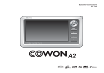 Manuel d’instructions ver. 1.2 F 2 COPYRIGHT Généralités • COWON est une marque déposée de COWON SYSTEMS, Inc. • Cet appareil est réservé à l’usage domestique et ne doit pas être utilisé à des fins commerciales. • Les droits d’auteur de ce manuel sont la propriété exclusive de COWON SYSTEMS, Inc. ; il est donc formellement interdit de distribuer tout ou partie de ce manuel sans autorisation écrite préalable. • JetShell et JetAudio sont la propriété exclusive de COWON SYSTEMS, Inc. ; il est donc formellement interdit de distribuer tout ou partie de ce manuel ou de l’utiliser à des fins commerciales sans autorisation écrite préalable. • La fonction de conversion de JetShell ou de JetAudio ne peut être utilisée qu’à des fins personnelles. Son utilisation à des fins commerciales constitue une infraction aux lois relatives aux droits d’auteur. • COWON SYSTEMS, Inc. se conforme aux lois et réglementations relatives aux enregistrements phonographiques, aux vidéos et aux jeux. Il incombe à l’utilisateur de respecter toutes les autres lois codifiées afférentes. • Nous conseillons à nos clients de s’inscrire à l’adresse http://www.COWON.com en tant que client officiel afin qu’ils puissent bénéficier des services spécialisés de iAUDIO. Ils pourront alors bénéficier des privilèges réservés aux clients officiels ayant rempli le formulaire d’enregistrement client. • Les utilisateurs n’ayant pas rempli le formulaire d’enregistrement seront considérés comme ne souhaitant pas bénéficier de ces avantages et pourront se voir refuser l’accès à certains services. • Les exemples, textes, dessins et photos contenus dans ce manuel peuvent faire l’objet de modifications destinées à améliorer la qualité du produit, sans autre préavis. • Les fonctions ou caractéristiques techniques citées dans ce manuel peuvent faire l’objet de modifications destinées à améliorer la qualité du produit sans autre préavis. A propos de BBE • BBE est produit sous la licence de BBE Sound, Inc. • BBE Sound, Inc. possède les droits de licence USP4638258, 5510752 et 5736897. • BBE et les symboles BBE sont des marques déposées de BBE Sound, Inc. All rights reserved by COWON SYSTEMS, Inc. COWON A2 Table des matières Précautions d’utilisation 4 1)Avant d’utiliser ce produit 5 1.Présentation du COWON A2 2.Contenu de l’emballage 3.Emplacement des commandes 4.Raccordement et recharge 5.Raccordement à un PC 6.Recharge avec un PC 7.Configuration du pilote Windows 98 8.Enregistrement de fichiers et débranchement de votre A2 9.Mise à jour du micrologiciel 2)Fonctions élémentaires 3 14 1.Lecture de fichiers 2.Boutons de commande 3)Fonctions élaborées 16 1.Navigateur 2.Liste de lecture 3.Raccordement Hôte USB 4.Mode radio 5.Mode Record 6.AV OUT 7.Papier peint 8.Mode Setup 4)Fonctions de configuration 1.Liste de configuration 2.Affichage 3.Son 4.Système 5.Informations 6.Lecteur de fichiers vidéo 7.Lecteur de fichiers musicaux 8.Radio 9.Enregistreur 5)Informations détaillées 1.Caractéristiques techniques de l’appareil 2.CD d’installation 3.Conversion de fichiers avec JetAudio VX Résolution des problèmes 23 31 35 COWON A2 4 Précautions d’utilisation • N’utilisez pas cet appareil à des fins autres que celles décrites dans ce manuel. • Pour votre sécurité, ne regardez pas de vidéos, d’images ou de textes enregistrés dans votre lecteur en conduisant. L’utilisation des autres fonctions de cet appareil pendant la conduite de votre véhicule comporte également des risques et peut entraîner des accidents mortels. • Ne passez pas de détergent ou tout autre produit chimique sur la surface du produit pour éviter tout risque de décoloration. Nettoyez le cas échéant la zone sale avec un chiffon doux. • N’exposez pas votre appareil à des températures inférieures à 0 °C ou supérieures à 40 °C, comme ce peut être le cas à l’intérieur de votre véhicule par exemple. Votre appareil risquerait d’être irrémédiablement endommagé. • Evitez de mettre votre appareil en contact avec l’eau et ne le rangez pas dans un endroit humide pendant de longues périodes. Si votre lecteur est endom magé parce qu’il a pris l’humidité, les éventuels dysfonctionnements rentrent alors dans le cadre des défauts par immersion et ne sont donc plus couverts par la garantie. Il se peut même que toute réparation, même payante, soit impossible et que vous ne puissiez plus utiliser votre appareil. • Ne démontez ni ne remontez le lecteur. Tout dommage résultant d’une telle manipulation annule la garantie et peut rendre toute réparation impossible à effectuer. • Prenez garde à raccorder les câbles correctement entre votre lecteur et votre ordinateur. Vous risqueriez d’endommager vos deux appareils. Ne posez pas d’objets lourds sur les câbles et ne les pliez pas. • Si le lecteur sent le brûlé ou chauffe trop lorsqu’il est en marche, retirez la batterie et prenez rapidement contact avec notre service après-vente. • En touchant le lecteur les mains mouillées, vous risquez d’endommager l’appareil et de causer des dysfonctionnements. Ne manipulez jamais la prise les mains mouillées : vous risqueriez de vous électrocuter. • En écoutant votre appareil avec un volume élevé pendant de longues périodes, vous risquez d’altérer vos capacités auditives. • L’utilisation du lecteur dans des endroits soumis à une forte électricité statique est susceptible d’entraîner des dysfonctionnements. • Les données enregistrées sur votre appareil pouvant être perdues suite à un choc, un dommage ou une erreur de manipulation, nous vous recommandons de toujours sauvegarder vos fichiers. Il arrive que toutes les données enregistrées dans le lecteur soient supprimées au cours d’une réparation. Notre service après-vente n’effectue aucune sauvegarde lors des 
