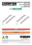 MANUEL DE L’OPÉRATEUR MODÈLE N°100470 PAIRE DE RAMPES EN ALUMINIUM MODÈLE N°100471 PAIRE DE RAMPES EN ACIER ENREGISTREZ VOTRE PRODUIT EN LIGNE sur www.championpowerequipment.com 100470 100471 ! DANGER Ne tentez JAMAIS de vous asseoir sur tout équipement pour descendre ou monter la rampe de chargement. ! AVERTISSEMENT Pour réduire le risque de blessures, l’utilisateur doit lire et comprendre le manuel d’utilisation avant d’utiliser ce produit. N’utilisez pas cet équipement si vous ne comprenez pas les avertissements et les instructions du manuel d’utilisation. ou rendez-vous sur championpowerequipment.com CONSERVEZ CES INSTRUCTIONS. Ce manuel contient des informations importantes relatives à la sécurité qui doivent être lues et comprises avant l’utilisation du produit. Dans le cas contraire, l’utilisateur s’expose à de graves blessures. Ce manuel doit être conservé avec le produit. Les spécifications, descriptions et illustrations figurant dans ce manuel correspondent aux informations connues au moment de la publication, mais peuvent être modifiées sans préavis. Fabriqué en Chine - REV 20180910 Champion Power Equipment, Inc., Santa Fe Springs, CA États-Unis 100470 - PAIRE DE RAMPES EN ALUMINIUM TABLE DES MATIÈRES TABLE DES MATIÈRES Introduction ................................................ 3 Définitions de sécurité ............................... 3 Instructions importantes relatives à la sécurité....................................................... 4 Pictogrammes de sécurité ...................................... 5 Pictogrammes de sécurité ...................................... 6 Caractéristiques ......................................... 7 Pièces incluses .................................................. 7 Assemblage ................................................ 7 Fonctionnement .......................................... 8 Entretien ..................................................... 9 Fiche technique .......................................... 9 Rampe en aluminium – modèle 100470 ....................... 9 Rampe en acier – modèle 100471 ............................. 9 100470 Schéma des pièces ................................... 10 100470 Liste de pièces ........................................ 10 100471 Schéma des pièces ................................... 11 100471 Liste de pièces ........................................ 11 2 INTRODUCTION 100470 - PAIRE DE RAMPES EN ALUMINIUM INTRODUCTION DÉFINITIONS DE SÉCURITÉ Félicitations pour votre achat d’un produit de Champion Power Equipment (CPE). CPE conçoit, fabrique et offre un soutien à l’ensemble de nos produits conformément à de strictes spécifications et directives. Avec une connaissance appropriée du produit, une utilisation sûre et un entretien périodique, ce produit devrait satisfaire vos attentes pendant des années. Les pictogrammes de sécurité visent à attirer votre attention sur les dangers potentiels. Il est essentiel de bien comprendre la signification des pictogrammes de sécurité. Les avertissements de sécurité n’éliminent pas tout danger. Les instructions ou avertissements qu’ils fournissent ne peuvent pas remplacer les mesures de prévention d’accidents appropriées. Nous déployons tous nos efforts pour assurer l’exactitude et l’intégralité de l’information contenue dans le présent manuel et nous nous réservons le droit de modifier, de changer et/ou d’améliorer le produit et le présent document à tout moment et sans préavis. CPE accorde une grande importance à la façon dont nos produits sont conçus, fabriqués, utilisés et entretenus, ainsi qu’à la sécurité de l’opérateur et aux personnes se trouvant à proximité de la génératrice. Par conséquent, il est IMPORTANT d’examiner attentivement ce manuel du produit et toute autre documentation du produit et d’être pleinement conscient et bien informé de l’assemblage, du fonctionnement, des risques et de l’entretien du produit avant de l’utiliser. Familiarisez-vous bien avec le produit et assurez-vous que toute autre personne voulant l’utiliser fasse de même, en observant les procédures d’utilisation et les consignes de sécurité adéquates avant chaque utilisation. Veuillez toujours faire preuve de bon sens et exercer la plus grande prudence lorsque vous utilisez le produit afin d’éviter des accidents, des dommages matériels ou des blessures. Nous espérons que vous continuerez d’utiliser votre produit de CPE pendant des années et que vous en serez satisfait. Lorsque vous communiquez avec CPE pour obtenir des pièces et/ou de réparation, vous devrez nous fournir les numéros de modèle et de série de votre produit. Transcrivez au tableau cidessous les informations figurant sur l’étiquette signalétique de votre produit. ! DANGER Le mot DANGER indique une situation dangereuse qui, si elle n’est pas évitée, causera des blessures graves ou mortelles. ! AVERTISSEMENT Le mot AVERTISSEMENT indique une situation dangereuse qui, si elle n’est pas évitée, pourrait causer des blessures graves ou mortelles. ! MISE EN GARDE MISE EN GARDE Indique une situation dangereuse qui, si elle n’est pas évitée, pourrait causer des blessures graves ou mortelles. " AVIS AVIS indique des informations considérées importantes, mais non liées aux dangers (ex., des messages relatifs aux dommages matériels). CPE ÉQUIPE DE SOUTIEN TECHNIQUE 1 877 338-0999 NUMÉRO DU MODÈLE 100470 / 100471 NUMÉRO DE SÉRIE DATE D’ACHAT LIEU D’ACHAT 3 100470 - PAIRE DE RAMPES EN ALUMINIUM INSTRUCTIONS IMPORTANTES RELATIVES À LA SÉCURITÉ INSTRUCTIONS IMPORTANTES RELATIVES À LA SÉCURITÉ – Ne chargez ou ne déchargez pas d’appareil électrique en marche. – Veuillez lire, comprendre et suivre toutes les instructions avant d’installer et d’utiliser le produit. – Ne laissez JAMAIS une personne utiliser ce produit si elle n’a pas l