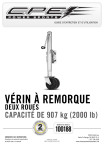 GUIDE D’ENTRETIEN ET D’UTILISATION VÉRIN À REMORQUE DEUX ROUES CAPACITÉ DE 907 kg (2000 lb) NUMÉRO DE MODÈLE 100188 CONSERVEZ CES INSTRUCTIONS Consignes de sécurité importantes incluses dans ce manuel. FABRIQUÉ EN CHINE REV 100188-20151102 12039 Smith Ave. Santa Fe Springs CA 90670 É.-U. 1 877 338-0999 www.championpowerequipment.com Pour des questions ou de l’assistance : ne pas retourner le produit en entrepôt. NOUS SOMMES LÀ POUR VOUS AIDER! Visitez notre site Web www.championpowerequipment.com pour en savoir plus : • info produits et mises à jour • foire aux questions • bulletins techniques • enregistrement du produit – ou – communiquer avec notre équipe du service à la clientèle sans frais au : 1 877 338-0999 *Nous tentons constamment d’améliorer nos produits. Par conséquent, le produit inclus peut différer légèrement de l’illustration. 100188 VÉRIN À REMORQUE DEUX ROUES CAPACITÉ DE 907 kg (2000 lb) TABLE DES MATIÈRES Introduction . . . . . . . . . . . . . . . . . . Introduction. . . . . . . . . . . . . . . . . Conventions de ce manuel . . . . . . . . . Consignes de sécurité . . . . . . . . . . . . Commandes et caractéristiques . . . . . Vérin de remorque . . . . . . . . . . . . Pièces fournies . . . . . . . . . . . . . . Montage . . . . . . . . . . . . . . . . . . . . . Choix du point de montage . . . . . . Fixation de la roue . . . . . . . . . . . . Fixation de la plaque . . . . . . . . . . Fonctionnement . . . . . . . . . . . . . . . . Arrimage . . . . . . . . . . . . . . . . . . . Désarrimage. . . . . . . . . . . . . . . . . Mise à niveau et déplacement . . . . Remorquage. . . . . . . . . . . . . . . . . Spécifications . . . . . . . . . . . . . . . . . Spécifications . . . . . . . . . . . . . . . Diagramme des pièces détachées . . Nomenclature des pièces. . . . . . . . . . . . . . . . . . . . . . . . . . . . . . . . . . . . . . . . . . . . . . . . . . . . . . . . . . . . . . . . . . . . . . . . . . . . . . . . . . . . . . . . . . . . . . . . . . . . . . . . . . . . . . . . . . . . . . . . . . . . . . . . . . . . . . . . . . . . . . . . . . . . . . . . . . . . . . . . . . . . . . . . . 1 . 1 . 2 . 3 . 4 . 4 . 4 . 5 . 5 . 5 . 5 . 6 . 6 . 6 . . 6 . . 6 . 7 . 7 . 7 . . 8 Garantie . . . . . . . . . . . . . . . . . . . . . . . . . . . . . . . Conditions de garantie. . . . . . . . . . . . . . . . . . . Garantie de réparations/remplacement . . . . . . . Ne pas rapporter le produit sur le lieu d’achat . . Exclusions de la garantie . . . . . . . . . . . . . . . . . Usure normale . . . . . . . . . . . . . . . . . . . . . . Installation, utilisation et entretien . . . . . . . . Autres exclusions . . . . . . . . . . . . . . . . . . . . Limites de la garantie implicite et des dommages indirects . . . . . . . . . . . . . . . . . . . . . . . . . . . . Coordonnées . . . . . . . . . . . . . . . . . . . . . . . . . Adresse . . . . . . . . . . . . . . . . . . . . . . . . . . Service à la clientèle . . . . . . . . . . . . . . . . . Service technique . . . . . . . . . . . . . . . . . . . 9 9 9 9 9 9 9 9 9 9 9 9 9 FRANÇAIS 100188 INTRODUCTION Introduction Félicitations d’avoir acheté un produit de Champion Power Equipment. Champion Power Equipment et Champion Engine Technology conçoivent, fabriquent et soutiennent tous leurs produits en fonction de spécifications et de lignes directrices strictes. Avec une connaissance appropriée du produit, un usage sécuritaire et un entretien régulier, ce produit devrait vous donner un service satisfaisant pendant des années. Des efforts ont été faits pour assurer l’exactitude et l’exhaustivité de l’information contenue dans le présent manuel. Nous nous réservons le droit de modifier, altérer et/ou améliorer le produit et le présent document à n’importe quel moment sans avis préalable. Puisque CPE/CET accorde une grande valeur à la conception, la fabrication et l’entretien des produits, ainsi qu’à votre sécurité et celle des autres personnes, nous aimerions que vous preniez le temps de lire entièrement ce manuel et les autres documents relatifs au produit afin d’être bien informé sur l’assemblage, le fonctionnement, la maintenance et les dangers associés au produit avant de l’utiliser. Familiarisez-vous avec le produit, et assurez-vous que les personnes qui prévoient utiliser le produit se familiarisent également avec les consignes de sécurité et les procédures de fonctionnement avant chaque utilisation. Faites toujours preuve de bon sens et de prudence lorsque vous utilisez le produit pour éviter les accidents, les dommages matériels ou les blessures. Nous espérons que vous continuerez d’utiliser votre produit CPE/CET et que vous serez satisfait pendant de nombreuses années. Notez les numéros de modèle et de série, ainsi que la date et le lieu d’achat, pour toute référence ultérieure. Conservez ces informations à disposition pour commander des pièces ainsi que pour toute assistance technique ou question de garantie. Assistance Champion Power Equipment 1 877 338-0999 Numéro de modèle 100188 Date d’achat Lieu d’achat 1 100188 FRANÇAIS CONVENTIONS de ce manuel Les symboles suivants sont utilisés pour permettre de différencier les types d’information. Le symbole de sécurité est utilisé avec un mot clé pour vous avertir de risques potentiels liés au fonctionnement et à la possession de cet équipement. Respectez toutes les consignes de sécurité pour éviter ou limiter tout risque de blessure grave, voire mortelle. DANGER DANGER indique un risque de danger imminent qui, s’il n’est pas évité, entraînera des blessures graves, voire mortelles MISE EN GARDE MISE EN GARDE indique une situation potentiellement dangereuse qui, si elle n’est pas évitée, pourrait entraîner des blessures graves, voire mortelles. ATTENTION ATTENTION utilisé sans le symbole d’alerte de sécurité indique une situation potentiellement d