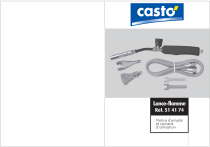 Lance-flamme Ref. 51 41 74 , Notice d emploi et, conseils d utilisation Lance-flamme CONTENU Page INSTRUCTIONS DE SECURITE 4 CARACTERISTIQUES TECHNIQUES 5 NOTICE DE MONTAGE 6 Les produits Casto' sont developpes au travers de notre experience pour repondre a tous vos besoins en vous garantissant economie, efficacite, fiabilite et securite Quelle que soit votre hate d'utiliser votre lance-flamme Casto', nous vous recommandons de lire attentivement cette notice. Son contenu vous fournira des indications importantes concernant le montage, l'installation, l'utilisation, l'entretien, la securite 2 3 INSTRUCTIONS DE SECURITE Les chalumeaux de chauffe et soudure sont des produits de tres haute qualite, testes individuellement, qui garantissent: facilite , d utilisation, excellentes performances et utilisation en toute securite. La connexion a la bouteille devra etre effectuee grace a un tuyau en caoutchouc homologue selon la norme en vigueur dans le pays d'utilisation. CARACTERISTIQUES TECHNIQUES ENTRETIEN Parfois, I'utilisation de gaz fort sale, generalement provenant du fond des bouteilles, peut entrainer l'obturation partielle du gicleur. Pour le nettoyer, demontez le bruleur et enlevez I'injecteur, lavez-le soigneusement avec de l'essence ou autre produit equivalent. Nettoyez eventuellement l'injecteur a l'aide d'un fil en acier tres fin. N'AGRANDISSEZ EN AUCUN CAS L'ORIFICE PRESENT SUR LE GICLEUR. AVANT DE COMMENCER A TRAVAILLER Assurez-vous que le tuyau de caoutchouc de connexion entre le chalumeau et la bouteille soit en parfait etat, qu'il soit bien fixe aux extremites au moyen des colliers serre-tubes et qu'il soit en mesure de supporter la pression d'utilisation. ALLUMAGE Ouvrez les robinets en commencant par celui de la bouteille, puis celui du regulateur de pression. Ouvrez ensuite de facon moderee le robinet situe sur le chalumeau. Approchez une flamme juste en dessous de la bouche du bruleur. PUISSANCE ET CONSOMMATION Le tableau des puissances et des consommations a ete elabore en utilisant du gaz Propane a une pression de 2.3 Atm. Type Lance-flamme Modele Pour chalumeaux Diametre bruleur (max) 17 mm Puissance (max) 2 kW Consommation (max) 180 gr/h UTILISATION L'intensite de la flamme est reglee par l'ouverture ou la fermeture du robinet. Si le produit est muni de levier d'ouverture rapide, reglez. au moyen de la manette, la flamme sur le ralenti, puis agir sur le levier afin d'obtenir de maniere immediate la flamme souhaitee. En relachant le levier, vous obtiendrez automatiquement et rapidement le retour a la flamme minimale reglee. 4 5 NOTICE DE MONTAGE Instructions pour l'assemblage et l'installation de l'appareil: NOTICE DE MONTAGE GARANTIE Le produit beneficie d'une garantie de 24 mois. ll doit etre retourne accompagne de l'etiquette contenue dans l'emballage. BRULEURS INTERCHANGEABLES Si I'appareil est dote de plusieurs bruleurs interchangeables ou si vous achetez des bruleurs supplementaires, procedez de la maniere suivante, enlevez le bruleur installe sur l'appareil, y compris le raccord hexagonal. Installez le nouveau bruleur avec le raccord hexagonal. TRES IMPORTANT Ce chalumeau et le tuyau de caoutchouc (s'il est present) ont ete controles et resultent sans defauts. Ne pas utiliser le tuyau pour tirer ou soulever de terre la bouteille de gaz. , Controler l etat du tuyau avant de commencer l'utilisation et le remplacer immediatement s'il a ete accidentellement coupe, chauffe, lezarde ou s'il montre des renflements ou des changements de diametres. Veuillez remplacer le tuyau de caoutchouc au plus tard 5 ans apres la date de fabrication marquee dessus. Le producteur ne sera en aucun cas responsable pour des dommages causes par une utilisation incorrecte du produit. AUTRES APPAREILS DISPONIBLES POUR VOTRE TRAVAIL Chalumeaux de chauffe et soudure avec ou sans levier avec longueur allant de 40 a 100 cm et bruleurs de 10 a 76 mm. Chalumeaux de chauffe et soudure avec bruleurs turbo et turbo , plus normaux et piezo de diametre 45-50 et 60 mm. Fers a souder lampes et fours normaux a allumage piezoelectrique avec porte-cartouche en plastique ou metal pour cartouches a forer. 6 Fers a souder lampes et fours normaux a allumage piezoelectrique pour cartouches avec valves fixation 7/16. 7 ">