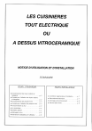 LES CUISINIERES TOUT ELECTRIQUE OU A DESSUS VITROCERAMIQUE NOTICE D'UTILISATION ET D’INSTALLATION SOMMAIRE POUR L'UTILISATEUR e Fonctionnement des foyers radiants et halogenes .......................... р. e Conseils pour l'utilisation des foyers radiants et halogenes. ........................ р. e Fonctionnement des plaques fonte ........ o) e Conseils pour l'utilisation des plaques fonte … p. e Fonctionnement du four... . ... р. ® Lacasserolerie.................... .......... р. e Entretien general. p. ® Nettoyage du four. ...................... .... р. ® Interventions réalisables par I'utilisateur . . . . . . . р. N ©) © & A OW WW WN POUR L'INSTALLATEUR e Conditions reglementaires d'installation....... p. 7 e Raccordement électrique... p. 7 ® Anomalies de fonctionnement .......... . .... p. 8 e Service Apres-Vente ......... p. 8 Pour l'utilisateur LES FOYERS RADIANTS sont constitués de résistances chauffantes boudinées, de forme circulaire ou autre. LES FOYERS HALOGENES sont constitués de lampes contenant un gaz halogéne régénérant un fil de tungstene a haute température ; ces lampes sont entourées d'une resis- tance chauffante circulaire. № Tous les foyers sont de type à "limiteur de température" ; la puissance du foyer sera limitée si la température dépas- se la valeur admissible pour le dessus vitrocéramique. REMARQUES POUR CUISINER ECONOMI- QUEMENT SUR DES FOYERS RADIANTS ET HALOGENES M Les récipients doivent être conçus pour la cuisine à l'électricité. Ils peuvent être en acier inoxydable à fond triple (sandwich acier, aluminium ou cuivre), en alumi- nium recouvert de téflon ou non, en matière céramique, en verre "vision", en tôle émaillée épaisse, ou en fonte (dans ce cas, choisissez plutôt un récipient à fond spé- cial pour plaque vitrocéramique, ex : VITROBASE). № || est important que le fond soit épais et bien plat pour être en contact avec toute la surface chauffante. Un récipient à fond creux ou bosselé donnera de faibles per- formances avec des points chauds qui peuvent brûler et laissera plus facilement des traces métalliques sur la table. HE Les performances les meilleures et la garantie de qualité dans le temps sont offertes en utilisant des casseroles dont le diamètre du fond correspond au dessin représentant chaque surface chauffante sur le dessus vitrocéramique. @ Un récipient plus petit peut être utilisé, sans risque pour la table, mais des calories seront perdues. S'il est plus grand, le temps de chauffe sera plus long. PRECAUTIONS D'UTILISATION ® La table chauffe à l'intérieur des zones délimitées par la sérigraphie, au-dessus des éléments chauffants. La cha- leur ne se disperse pratiquement pas autour de ces zones. © L'utilisation de la table comme planche à découper est à proscrire. @ Les cuissons directes sur la plaque sont déconseillées. Ne posez pas d’objets en plastique sur la table encore chaude. © Ne placez pas ou ne laissez pas un récipient émaillé ou en aluminium, vide, sur une zone chauffante. ® N'employez jamais de feuille de papier d'aluminium, et ne placez pas de produits emballés sous aluminium directe- ment sur la table pour les cuissons ; cela risquerait d'en- dommager définitivement votre appareil. Ш Les commandes de puissance sont Ш Les voyants affectées à chaque foyer. Elles permet- tent 6 allures de chauffe ; "zero" (0) est la position arrêt ; "six" (6) la position donnant la puissance la plus élevée. Sur la vitrocéramique : si la température de surface dépasse une certaine limite, le témoin de chaleur rési- duelle s’allume même après coupure du foyer radiant. Soyez prudents car la zone de cuisson est encore chaude. Sur le bandeau de commande : un voyant s'allume lors de la mise en fonctionnement du foyer. INOX ACIER CUIVRE OU ALU INOX I — À I= —æ " о v u y MAUVAIS => a @ La table peut être rayée par des matériaux plus durs qu'elle, des grains de sable par exemple, apportés par des légumes et transportés par le fond des récipients. @ Les fonds d'ustensiles trop grossiers, peuvent retenir et transporter des matières qui provoqueront des taches sur la table. © Evitez les projections de sucre et les débordements de sirop de sucre ou confiture, les enlever immédiatement car ils peuvent être à l'origine de minuscules éclats. Attention : @ Ne regardez pas fixement un foyer halogène en fonction- nement. @ Le plan de cuisson en verre de votre cuisinière ne doit pas être utilisé pour entreposer quoi que ce soit et notamment des récipients en matière plastique ou des feuilles d’aluminium sur la surface encore chaude. Pour l'utilisateur I! existe deux sortes de commandes de plaques : M Plaque fonte rapide à limiteur de température avec repères de 0 à 6. MM Plaque fonte rapide commandée par doseur d'énergie avec repères de 0 а 11. M Utilisez des récipients a fond plat qui reposeront parfaite- ment sur la surface du foyer : © en acier inoxydable avec fond épais ou sandwich, e en aluminium avec fond épais, @ en acier émaillé (tôle épaisse). M Adaptez la taille du récipient au besoin réel : le diamètre du fond du récipient doit être égal ou supérieur à celui du foyer utilisé. Utilisez un couvercle le plus souvent possible pour réduire les pertes par évaporation. Lorsque votre préparation arrive à ébullition, il est inutile de la laisser bouillir à gros bouillons ; les aliments ne cuisent pas plus vite. ls cuiront mieux sur puissance douce qui maintient une légère ébullition. H En coupant le courant avant la fin de cuisson, vous bénéfi- ciez de la chaleur accumulée dans la plaque et réalisez ainsi des économies d'énergie. H Utilisez des récipients à fond sec pour éviter l'oxydation des plaques. PREMIÈRE UTILISATION : Avant d'utiliser votre four pour la première fois, laissez-le chauffer a vide, porte fermée, pendant 15 minutes environ sur la position maxi. La laine minérale q