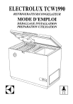 ELECTROLUX TCW1990 REFRIGERATEUR/CONGELATEUR MODE D'EMPLOI DEBALLAGE INSTALLATION PREPARATION UTILISATION Electrolux MADE IN DENMARK X I 1 E | ect rol u N MADE IN DENMARK | MOD l'ICW 1990 | | R12 PROD.NO ка | VOL. BRUT | |9206810-24 | | 220 VN 50 112 | H69560688 ЗЕЯ. МО MOD PROD.NO | || [16 1990 |] [9206810-26] | WI 10 1104145 Vo, 5050 Hz] cuass T R12 kg | VOL. BRUT Hoo oo & 8 T = Electrolu x MADE IN DENMARK \ N EH 6005668 MOD PROD. NO SER. NO | cw 1990 ||9206810-28 | | | 220 VA So Hz] w|-} 10m R12 kg | VOL. BRUT | cuass T J wi 16 = ess <= eo Sod, Ey ag pu НИ de a a e 1 a И 1 | | | | | | | | | | | J 7 ELECTROLUX DANMARK A/S NOTICE D'UTILISATION ET DE MAINTENANCE REFRIGERATEUR-CONGELATEUR AVEC CAPACITE DE CONGELATION DE BACS À GLACE MODELE TCW 1990 DEBALLAGE : 1) 2) 3) 4) 5) Couper les sangles. Dégager le couvercle en tordant les plaques métalliques. Retirer le couvercle. Enlever l’enveloppe extérieure. Découper l'emballage en plastique et retirer les cadres en bois ainsi que la mousse protectrice. INSTALLATION : 1) 2) 3) Vérifier la plaque signalétique à l'arrière de l'appareil. Les caractéristiques de voltage, de fréquence et de taille de fusible doivent correspondre aux normes locales en matière d'alimentation électrique. Adapter une prise au cordon d'alimentation en respectant les normes locales d'installation électrique. Attention ! Cet appareil doit être relié à la terre par un cordon vert et jaune. Lors de remplacement du fil d'alimentation, celui-ci doit être bien dégagé-du ventilateur ainsi que de toute partie chaude à l'intérieur du compartiment du compresseur. Connecter le cordon à la prise et allumer l'appareil. Vérifier que le compresseur fonctionne, ainsi que le ventilateur du compresseur situé du côté droit du compartiment. Le voyant lumineux vert indique que l'appareil est en marche. EMPLACEMENT : Il est préférable de placer l’appareil dans une piece bien aérée, en ménageant un espace entre l'appareil et les murs arrières et latéraux (voir illustration). L'exposition directe de l'appareil au soleil ainsi qu’à toute autre source de chaleur est déconseillée. PREPARATION: 1) Débrancher l'appareil. 2) Retirer la cuve interne du réfrigérateur ainsi que le rebord supérieur, en défaisant les rivets sur le bord supérieur. 3) Remplir tous les conteneurs d’eau propre, y compris celui du couvercle: visser les bouchons et essuyer. 4) Déposer les 5 petits ice-packs dans le fond du réfrigérateur (voir illustration). 5) Empiler les 36 ice-packs dans le plus grand compartiment de congélation. [| est important de les empiler exactement comme sur le croquis afin de permettre une circulation d’air autour des bacs à glace et d'éviter les complications entrainées par la dilatation pendant la congélation. 6) Allumer l'appareil pendant un instant et vérifier que le petit ventilateur au bas de la cloison de séparation fonctionne. Débrancher à nouveau. 7) Replacer la cuve intérieure ainsi que le rebord supérieur et rabaisser les rivets. 8) Fermer le couvercle et mettre l’appareil en marche. 9) Au bout de 48 heures, il faut régler le thermostat jusqu’à ce que le thermomètre indique la tempé- rature voulue. Tourner dans le sens des aiguilles d’une montre pour obtenir une température inférieure. Vérifier la température de stockage sur les boîtes de médicaments en question. En règle générale, le sérum doit être stocké à une temperature comprise entre O et 8°C dans le compartiment réfrigéré. En même temps, la température dans le compartiment de congélation sera de -15°C -25°C., 10) Une fois la température stabilisée, remplir le compartiment réfrigérant de vaccines. UTILISATION : Le plus petit compartiment découvert est prévu pour la congélation d'ice-packs. Ceux-ci ne sont pas fournis mais doivent étre achetés séparément. Il est possible de congeler et stocker 16 ice-packs. Les ice-packs dans ce compartiment peuvent contribuer au refroidissement lorsqu'ils sont stockés avec les médicaments dans des conteneurs isothermes pour des transports de courte durée. Ces ice-packs doivent être remplacés par des ice-packs "non congelés", en gardant autant que possible le même nombre de bacs dans l'appareil. Suivre les instructions concernant le transport des vaccins et autres médicaments. DUREE DE MAINTIEN DU FROID : En cas de coupure de courant, l'appareil rempli avec le maximum d'ice-packs peut maintenir la température en-dessous de 8°C, dans les limites suivantes : température ambiente : durée minimale de stockage : 32°C 30 heures 46°C 20 heures Cet appareil est capable de maintenir une température inférieure à 8°C dans le compartiment réfrigéré, même dans le cas de coupures de courant quotidiennes de 16 heures d'affilée toutes les 24 heures. DEGIVRAGE ET NETTOYAGE : Lorsque la formation de glace sur l'évaporateur dans le compartiment de congélation atteint 10 mm dépaisseur, il est conseillé de procéder au dégivrage : 1) Débrancher Гаррагей. 2) Retirer le petit bouchon de vidange du trou d'écoulement dans le fond (mais le conserver pour la réinsertion). Placer une cuvette sous le trou découlement afin de récupérer l’eau. 3) Vider le compartiment réfrigérant de son contenu et stocker ces paquets qui seront soigneusement refroidis jusqu'à une température de 0 à 8°C. 4) Retirer les ice-packs du compartiment de congélation découvert et les stocker dans un endroit isotherme afin de les maintenir congelés. 5) Laisser le couvercle de l'appareil ouvert jusqu’à ce que la glace autour du rebord ait fondu partiellement. Les paillettes de glace peuvent être détachées au moyen d’un râcloir en plastique ou en bois. Attention ! Ne jamais utiliser de râcloir métallique ni tout autre instrument qui risquerait d'endommager l’évaporateur (élément de refroidissement). 6) 7) 8) 10) 11) 12) 13) 14) 15) 16) Défaire les rivets en plastique autour 