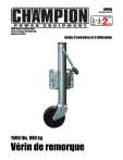 80005 Rev 80005-20131119 10006 Santa Fe Springs Road Santa Fe Springs, CA 90670 USA Fabriqué en Chine 1500 lbs. 680 kg Guide d’entretien et d’utilisation Vérin de remorque Table des matières Introduction ..................................... 1 Vérin de remorque ................................... 1 Accessoires ................................................ 1 Concernant ce manuel .............................. 1 Conventions de ce manuel ................ 2 Consignes de sécurité ....................... 3 Commandes et caractéristiques ........ 4 Vérin de remorque .................................... 4 Pièces fournies .......................................... 4 Montage ........................................... 5 Choix du point de montage ...................... 5 Fixation de la Roue ................................... 5 Fixation de la plaque ................................ 5 Base interchangeable ................................ 5 Fonctionnement ............................... 6 Arrimage ................................................... 6 Désarrimage.............................................. 6 Mise à niveau et déplacement .................. 6 Remorquage .............................................. 6 Spécifications ................................... 7 Spécifications du moteur .......................... 7 Diagramme des pièces détachées ............. 7 Nomenclature des pièces .......................... 8 Garantie ........................................... 9 Conditions de garantie ............................. 9 Garantie de réparations/remplacement .. 9 Ne pas ramener le produit sur le lieu d’achat. ..................................................... 9 Exclusions de la garantie ......................... 9 Usure normale ...................................... 9 Installation, utilisation et entretien ..... 9 Autres exclusions.................................. 9 Limites de la garantie implicite et des dommages indirects ................................. 9 Coordonnées ............................................ 9 Adresse ................................................. 9 Service à la clientèle ............................. 9 Service technique ................................. 9 Remarques ..................................... 10 Introduction Introduction Accessoires Nous vous félicitons d’avoir fait l’acquisition d’une cric à remorque Champion Power Equipment. CPE conçoit et fabrique de cric à remorque avec des spécifications rigoureuses. Avec des conditions d’utilisation et d’entretien adéquates, cette cric à remorque vous donnera entière satisfaction pendant des années. Vérin de remorque Cette unité est un cric à remorque d'une capacité de 1 500 lb avec arrière pivotant. Elle est prévue pour installation sur la languette d'une remorque afin de faciliter et rendre plus sûr l'arrimage, le désarrimage, la mise à niveau et le déplacement de votre remorque. Champion Power Equipment fabrique et vend des accessoires destinés à vous aider à rentabiliser au mieux votre investissement. Veuillez visiter notre site web à www.championpowerequipment.com Concernant ce manuel Nous avons fait notre maximum pour que les informations présentées dans ce manuel soient aussi précises et complètes que possible. Nous nous réservons le droit de modifier, d’altérer et/ou d’améliorer le produit et ce document à tout moment et sans notification préalable. Notez les numéros de modèle et de série, ainsi que la date et lieu d’achat, pour toute référence ultérieure. Conservez ces informations à disposition pour commander des pièces ainsi que pour toute assistance technique ou question de garantie. Assistance Champion Power Equipment 1 877 338-0999 Numéro de modèle 80005 Date d’achat Lieu d’achat Rev 80005-20131119 1 Conventions de ce manuel Conventions de ce manuel Les symboles suivants sont utilisés dans ce manuel pour permettre de différencier les types d’information. Le symbole sécurité est utilisé comme mot clé pour vous avertir de risques potentiels liés au fonctionnement et à la possession de matériel électrique. Respectez toutes les consignes de sécurité pour éviter ou limiter tout risque de blessure grave ou mortelle. DANGER Indique un risque de danger imminent qui, s’il n’est pas évité, entraînera des blessures graves, voire mortelles MISE EN GARDE ATTENTION ATTENTION : indique une situation potentiellement dangereuse qui, si elle n’est pas évitée, peut occasionner des blessures légères ou modérées. ATTENTION ATTENTION : utilisé sans le symbole d’alerte de sécurité, ce terme indique une situation potentiellement dangereuse qui, si elle n’est pas évitée, peut occasionner des dégâts matériels. REMARQUE Si vous avez des questions concernant votre cric à remorque, nous pouvons vous aider. Veuillez pour cela appeler notre ligne d’assistance téléphonique au 1 877 338-0999. MISE EN GARDE : indique une situation potentiellement dangereuse qui, si elle n’est pas évitée, pourrait entraîner des blessures graves, voire mortelles. 2 Rev 80005-20131119 Consignes de sécurité Consignes de sécurité MISE EN GARDE Lire attentivement ce manuel avant d’utiliser le cric à remorque. Le non respect de ces instructions peut entraîner des blessures graves, voire mortelles. MISE EN GARDE NE JAMAIS excéder la capacité nominale de charge (1 500 lb) pour le cric à remorque. DANGER TOUJOURS garder les mains, les pieds, les bras et les jambes éloignés de la languette de remorque lors de l’arrimage, du désarrimage ou du déplacement de votre remorque. DANGER NE JAMAIS laisser les enfants actionner le cric à remorque. Garder les enfants en sécurité et éloignés lors du fonctionnement du cric à remorque. MISE EN GARDE DANGER Demeurer vigilant pour empêcher le mouvement imprévu de la remorque lors de l’utilisation du cric à remorque. NE JAMAIS desserrer, ajuster ou démonter 