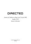Système de Télédéverrouillage Passif Directed (PKE) Modèle 2102T Manuel d'utilisateur © 2012 Directed, Vista, CA G2102T Contents Règlements gouvernementaux..............................................................................4 Avertissement ! La sécurité d’abord.....................................................................6 Information importante........................................................................................6 L'entretien du système.................................................................................6 Maximiser la performance de votre système..................................................6 Utilisation du système.........................................................................................7 Déverrouillage et verrouillage automatique du véhicule..................................7 Déverrouillage et verrouillage manuel du véhicule.........................................8 Activation et désactivation du mode valet.....................................................8 L’activation et désactivation automatique du mode veille.................................9 Verrouillage intelligent................................................................................9 Glossaire........................................................................................................12 Garantie à vie limitée pour l’utilisateur................................................................13 © 2012 Directed. Tous droits réservés. 3 Règlements gouvernementaux Cette unité est conforme avec la Partie 15 des règlements du FCC. L’opération est sujet aux deux conditions suivantes : (1) Cette unité ne doit pas causer de l’interférence nuisible, et (2) Cette unité doit accepter toute interférence reçue, incluant une interférence qui peut causer une opération non-désirée. L’équipement a été testé et est conforme à l’intérieur des limites d’une unité numérique classe B, selon la Partie 15 des règlements du FCC. L’équipement génère et peut émettre des radiofréquences et, si l’équipement n’est pas installé ni utilisé selon les instructions décrites dans le manuel, peut causer des interférences nuisibles aux radiocommunications. Par contre, il n’y a aucune garantie que l’interférence ne se produira pas dans une installation. Si cet équipement cause des interférences nuisibles à une radio ou une télévision, qu’on peut déterminer en fermant et allumant l’équipement, l’utilisateur est encouragé de faire une tentative de corriger l’interférence par une ou plusieurs des solutions suivantes : • • • • Réorienter ou relocaliser l’antenne receveur. Augmenter l’espace entre l’équipement et le receveur. Brancher l’équipement dans une sortie sur un circuit différent de celui où le receveur est branché. Consulter le concessionnaire ou un technicien radio / TV d’expérience pour de l’aide. Pour satisfaire aux exigences de conformité à l’exposition RF de la FCC, cette unité doit être utilisée dans des configurations manuelles, tenues à la main seulement. Cette unité est conçue pour être utilisée dans la main d’une personne et sa configuration d’opération ne supporte pas les transmissions normales lorsque placée dans une poche ou un étui adjacent du corps de la personne. Cette unité est conforme avec Industrie Canada sur les normes radioélectriques RSS 210. L’usage est autorisé seulement sur une base de non-interférence, nonprotection; autrement dit, cette unité ne doit pas être utilisée s’il est déterminé qu’elle causera des interférences nuisibles aux services autorisés par IC. En plus, l’utilisateur de cette unité doit accepter les radiointerférences qui peuvent 4 © 2012 Directed. Tous droits réservés. être reçus, même si cette interférence peut affecter l’opération de cette unité. Avertissement: L’installation du produit ne doit être faite que par un technicien entrainé ou certifié par un concessionnaire autorisé Directed. Tout changement ou modification non approuvé par la partie responsable à la conformité peut rendre nul le droit de l’usager d’opérer cette unité. © 2012 Directed. Tous droits réservés. 5 Avertissement ! La sécurité d’abord L’avertissement de sécurité suivant doit être respecté en tout temps: En raison de la complexité du système, l’installation du produit ne doit être faite que par un concessionnaire autorisé Directed. Information importante Félicitations pour l’achat de votre système haute technologie de télédéverrouillage passif (PKE). En raison de la complexité du système, l’installation ne doit être faite que par un concessionnaire autorisé seulement. Si l’installation du produit n’est pas faite par un concessionnaire autorisé la garantie sera nulle. Tous les concessionnaires ont un certificat du concessionnaire pré-imprimé pour la vérification d’autorisation En lisant attentivement ce manuel d’utilisateur avant l’utilisation de votre système, vous pourrez maximiser l’utilisation du système et ses caractéristiques. Vous pouvez imprimer des copies additionnelles du manuel en visitant notre site web à www.xpresskit.com. L'entretien du système Le système ne nécessite aucun entretien spécifique. La télécommande est alimentée par une petite batterie bouton légère 3 volts au lithium (CR2032) et sa durée approximative est de trois ans d’usure normale. Lorsque la batterie commence à faiblir, la portée d’opération est réduite. Maximiser la performance de votre système Ne jamais placer la télécommande passive près d'un téléphone cellulaire, ceci peut affecter la portée ainsi que la performance. Une troisième antenne peut être installée pour augmenter la portée de la zone active. L'installation doit être faite par un technicien entrainé ou certifié par un concessionnaire autorisé Di