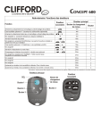 CLIFFORD La science de la sécurité CONCEPT 600 MD Aide-mémoire: Fonctions des émetteurs Émetteur secondaire * + + Non assignée* + Activation et désactivation du mode Valet + Outrepassage du détecteur de proximité 4 à double zones optionnel Non assignée ou assignée pour IntelliStart 4: Faible courant, basse température et transmission manuelle Non assignée* + Non assignée* Non assignée* Ajustement par émetteur de la sensibilité du détecteur Omni à double zones Ajustement par émetteur de la sensibilité du détecteur de proximité 4 à double zones * * * UJ + UJ Activation temporisée des phares Non assignée ou accessoire SmartWindows 4 qui permet l’ouverture complète ou partielle de la vitre pour ventilation o Canal auxiliaire optionnel n 3 *(IntelliVoice 4, voix synthétisée «on/off») UJ Armement ou désarmement et verrouillage ou déverrouillage des portières Canal auxiliaire optionnel no1 *(ouverture du coffre arrière optionnelle) Armement ou désarmement silencieux et verrouillage ou déverrouillage des portières Non assignée ou accessoire démarreur à distance IntelliStart 4 UJ Fonction Émetteur principal Bouton de changement Bouton de niveau non non non non 1 fois 1 2 3 4 1 1 fois 2 1 fois 1 fois 2 fois 2 fois 3 4 1 2 fois 3 2 fois 3 fois 3 fois 3 fois 3 fois 4 1 2 2 3 4 * Ces boutons / canaux peuvent être assignés pour faire fonctionner les systèmes Clifford ainsi que les accessoires de vos autres véhicules. Émetteur principal DEL Bouton 1 Bouton 4 Bouton 3 Bouton de changement de niveau Bouton 2 Émetteur secondaire ">