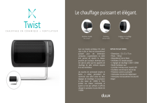 Le chauffage puissant et élégant. CHA UF F A GE EN Twist CÉRAMIQUE + V ENTILA TE UR Ventilateur double DC puissant Oscillation verticale (50⁰) Avec son double ventilateur DC, placé côte à côte, le Twist est étonnamment puissant pour ses dimensions compactes. L'augmentation du débit d'air permet de répartir la chaleur produite par la plaque céramique plus loin dans la pièce que les appareils de chauffage de taille similaire équipés d'un seul ventilateur. Les touches de commande simples et faciles à utiliser permettent de commuter sans effort entre les deux réglages de chauffage. A la puissance la plus basse de 1.000W le Twist produit une chaleur confortable et quand ce n'est pas suffisant, il suffit de changer la puissance la plus élevée de 1.500W. 2 réglages de chauffage (1000+1500w) SPECIFICATIONS • Dimensions - 22 x 12 x 17 cm • Poids - 1100 gr • Disponible en noir et blanc • Ventilateur DC double puissant • 2 réglages de chauffage (1.000+1.500W) • Mode Ventilateur seul • Contrôles minimaux avec voyants LED • Oscillation vers le haut et vers le bas • Protection contre la surchauffe • Interrupteur de sécurité indépendant • Interrupteur de basculement de sécurité intégré ">