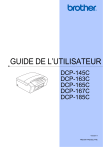 GUIDE DE L’UTILISATEUR DCP-145C DCP-163C DCP-165C DCP-167C DCP-185C Version A FRE/SWI-FRE/BEL-FRE Si vous devez appeler le service à la clientèle Remplissez les informations suivantes à des fins de référence ultérieure : Numéro du modèle : DCP-145C, DCP-163C, DCP-165C, DCP-167C et DCP-185C (Entourez le numéro de votre modèle) Numéro de série : 1 Date d'achat : Lieu d'achat : 1 Le numéro de série se trouve à l'arrière de l'appareil. Gardez ce Guide de l'utilisateur avec votre reçu comme confirmation de la date d'achat de votre appareil en cas de vol, d'incendie ou de service de garantie. Enregistrez votre produit en ligne à l'adresse http://www.brother.com/registration/ En enregistrant votre produit auprès de Brother, vous serez enregistré comme le premier propriétaire du produit. Votre enregistrement auprès de Brother : pourra servir de confirmation de la date d'achat de votre produit en cas de perte du reçu ; et pourra appuyer une demande de réclamation auprès de l'assurance en cas de perte d'un produit couvert par une assurance. © 2008 Brother Industries, Ltd. Avis de compilation et de publication Ce manuel a été compilé et publié sous le contrôle de Brother Industries, Ltd. Il couvre les dernières descriptions et spécifications du produit. Le contenu de ce manuel et les spécifications de ce produit peuvent être modifiés sans préavis. Brother se réserve le droit de modifier, sans préavis, les spécifications et les informations figurant dans le présent manuel et ne sera pas responsable des préjudices (y compris des préjudices indirects) résultant des informations présentées ici, entre autres, sans pour autant s'y limiter, des erreurs typographiques et d’autres erreurs concernant la publication. i Déclaration de conformité pour la CE ii Déclaration de conformité pour la CE Fabricant Brother Industries, Ltd. 15-1, Naeshiro-cho, Mizuho-ku, Nagoya 467-8561, Japon Usine Brother Industries (Shen Zhen) Ltd G02414-1, Bao Chang Li Bonded Transportation Industrial Park, Bao Long Industrial Estate, Longgang, Shenzhen, Chine Déclarent par la présente que : Description des produits : Photocopieuse/Imprimante Nom du modèle : DCP-145C, DCP-165C, DCP-185C, DCP-163C, DCP-167C sont conformes aux dispositions des directives appliquées : Directive sur la basse tension 2006/95/CE et la Directive sur la compatibilité électromagnétique 2004/108/CE. Normes appliquées : Harmonisées : Sécurité CEM EN60950-1: 2001 +A11: 2004 EN55022: 2006 Classe B EN55024: 1998 +A1: 2001 +A2: 2003 EN61000-3-2: 2006 EN61000-3-3: 1995 +A1: 2001 +A2: 2005 Année de la première apposition du marquage CE : 2008 Émis par : Brother Industries, Ltd. Date : 15 février 2008 Lieu : Nagoya, Japon iii Table des matières Section I 1 Généralités Informations générales 2 Comment utiliser la documentation .......................................................................2 Symboles et conventions utilisés dans la documentation ...............................2 Comment accéder au Guide utilisateur - Logiciel ..................................................2 Comment consulter la documentation .............................................................2 Accès au soutien Brother (Pour Windows®) ..........................................................5 Vue d'ensemble du panneau de commande .........................................................6 Indications de la DEL d'avertissement.............................................................7 2 Chargement des documents et du papier 8 Chargement du papier et d'autres supports d'impression .....................................8 Chargement d'enveloppes et de cartes postales...........................................10 Pour enlever les imprimés de petit format de l'appareil.................................12 Zone imprimable ............................................................................................13 Papier et autres supports d'impression acceptables ...........................................14 Support d'impression recommandé ...............................................................14 Manipulation et utilisation des supports d'impression....................................15 Sélection du support d'impression approprié.................................................16 Chargement de documents .................................................................................18 Utilisation du chargeur ADF (DCP-185C uniquement) ..................................18 Utilisation de la vitre du scanner....................................................................19 Zone numérisable ..........................................................................................19 3 Configuration générale 20 Écran LCD ...........................................................................................................20 Changement de la langue de l'écran LCD.....................................................20 Amélioration de l'angle de l'écran LCD..........................................................20 Mode Veille ..........................................................................................................20 Impression de rapports ........................................................................................21 Comment imprimer un rapport.......................................................................21 iv Section II Copie 4 Copies de documents 24 Comment faire des copies ...................................................................................24 Copie simple de documents ..........................................................................24 Copies multiples de documents..................................................................... 24 Arrêt de la copie ............................................................................................ 24 Options de copie...................................................................