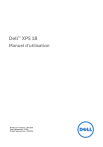 Dell™ XPS 18 Manuel d’utilisation Modèle de l'ordinateur : XPS 1820 Type réglementaire : W01A Modèle réglementaire : W01A002 Remarques, précautions et avertissements REMARQUE : Une REMARQUE fournit des informations importantes qui vous aident à mieux utiliser votre ordinateur. PRÉCAUTION : Une MISE EN GARDE indique un risque d’endommagement potentiel du matériel ou de perte de données en cas de non-respect des instructions fournies. AVERTISSEMENT : un AVERTISSEMENT indique un risque de dommage, de blessure corporelle ou de mort. Copyright © 2014 Dell Inc. Tous droits réservés. Ce produit est protégé par les lois des États-Unis et les droits internationaux de copyright et de propriété intellectuelle. Dell™ et le logo Dell sont des marques commerciales de Dell Inc. aux États-Unis et/ou dans d'autres juridictions. Toutes les autres marques et les noms mentionnés dans ce document peuvent être des marques commerciales de leurs sociétés respectives. 2014 - 04 Rév. A00 Table des matières Caractéristiques�������������������������������������������������������������������� 5 Accessoires ��������������������������������������������������������������������������� 9 Configurer votre ordinateur����������������������������������������������11 Chargement de votre ordinateur�������������������������������������������������11 Allumer votre ordinateur ���������������������������������������������������������������13 Activer/Désactiver le Wi-Fi ����������������������������������������������������������� 14 Se connecter à un réseau�������������������������������������������������������������� 14 Insérer une carte mémoire (vendue séparément) - Facultatif�������������������������������������������������15 Retrait de la carte mémoire���������������������������������������������������������� 16 Utilisation de votre ordinateur �����������������������������������������17 Orientation de l'écran ���������������������������������������������������������������������17 Menu Démarrer de Windows �������������������������������������������������������17 Gestes�������������������������������������������������������������������������������������������������� 18 Utiliser le clavier et la souris ���������������������������������������������������������21 Utilisation Casque/Microphone �������������������������������������������������� 23 Éteindre l'écran�������������������������������������������������������������������������������� 24 Mise hors tension de votre ordinateur �������������������������������������� 24 Synchronisation de votre ordinateur à l'aide d'un compte Microsoft��������������������������������������������������������������� 26 Table des matières │ 3 Socle d'alimentation���������������������������������������������������������� 27 Caractéristiques ������������������������������������������������������������������������������ 27 Utilisation du socle d'alimentation���������������������������������������������� 29 Nettoyage de votre ordinateur���������������������������������������� 32 Dépannage ������������������������������������������������������������������������� 33 Où trouver le numéro de service et le code de service express�����������