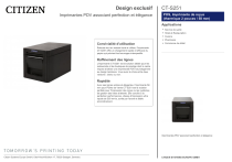Design exclusif Imprimantes PDV associant perfection et élégance CT-S251 POS, Imprimante de reçus (thermique 2 pouces / 58 mm) Applications Service de santé Hotel et Restauration Cuisine Pharmacie Convivialité d'utilisation Commerce de détail Robuste tout en restant facile à utiliser, l'imprimante CT-S251 offre un chargement rapide et efficace du papier qui prévient les bourrages intempestifs. Raffinement des lignes L'imprimante CT-S251 est la solution idéale pour les restaurants et les boutiques de prestige dont le cadre impose d'utiliser une imprimante PDV haut-degamme au design tendance. Vous avez le choix entre deux versions : blanc ou noir. Rapidité Avec ses lignes sobres et élégantes, l'imprimante 58 mm pour Points de Vente CT-S251 est la solution parfaite pour l'impression des reçus ou les systèmes de gestion des listes d'attente. Elle concilie à la perfection performances, vitesse d'impression ultra rapide de 300 mm/s, sortie par l'avant et faible encombrement. Imprimantes PDV associant perfection et élégance Citizen Systems Europe GmbH, Otto-Hirsch-Brücken 17, 70329 Stuttgart, Germany CITIZEN SYSTEMS EUROPE GMBH CT-S251 POS, Imprimante de reçus (thermique 2 pouces / 58 mm) Caractéristiques Connectivité optimale avec la possibilité d'opter pour des interfaces USB, série, MFi Bluetooth®, Ethernet et Wifi Caractéristiques & Avantages Sortie papier: Sortie papier frontale, chargement du média par le haut Modèle CT-S251 Technologie d'impression Thermique directe Résolution 203 dpi Vitesse d'impression (maximum) 300 mm / sec. , Échelle de gris max. 130 mm / sec. Faible encombrement - l'alimentation intégrée permet un Largeur d'impression (maximum) 54 mm poste de travail optimisé Largeur du support (min au maximum) 57.5 mm (+/- 0,5 mm) Taille du rouleau (max.), Taille du mandrin Diamètre extérieur de 83 mm Conformité ENERGY STAR® Épaisseur du papier (min au maximum) 53 à 85 µm Faible encombrement Interface principale Interface double USB 2.0 + 10/100 Ethernet (LAN) Source de courant 100 - 240V, 50/60hz Emulations (langages) ESC/POS™ Taille (L x P x H) et Poids 108x165x108 mm + 5mm avant, 1.2 Kg Charge de papier: Changement rapide et facile des supports - chargement papier en drop-in Vitesse d'impression: Impression ultra rapide des reçus jusqu'à 300 mm par seconde Mobile-POS prêt Notification facile - Alarme intégrée Impression longue durée (Long Life Print: LLP) Emballage recyclable Modes impression, sommeil et veille Maintenance sans outil Tous les noms de produits sont des marques commerciales de leurs fabricants respectifs. Zebra® est une marque commerciale de ZIH Corp. Datamax® est une marque commerciale de Datamax-O'Neil Corporation. Le design, les caractéristiques techniques et la disponibilité sont susceptibles d‘être modifiés sans préavis. Sauf erreurs ou omissions. Connectivité optimale Citizen Systems Europe GmbH, Otto-Hirsch-Brücken 17, 70329 Stuttgart, Germany CITIZEN SYSTEMS EUROPE GMBH ">