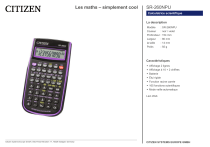 Les maths – simplement cool SR-260NPU Calculatrice scientifique La description Modèle : SR-260NPU Couleur : noir / violet Profondeur : 154 mm Largeur : 80 mm la taille : 14 mm Poids : 92 g Caractéristiques Affichage 2 lignes Affichage à 10 + 2 chiffres Batterie Étui rigide Fonction racine carrée 165 fonctions scientifiques Mode veille automatique Lien Web Citizen Systems Europe GmbH, Otto-Hirsch-Brücken 17, 70329 Stuttgart, Germany CITIZEN SYSTEMS EUROPE GMBH ">