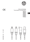 80270009 / 00 10 / 2017 Notice de Montage Transmetteurs de température TA3xxx TA4xxx TA5xxx TU3xxx TU4xxx TU5xxx FR 1 Consignes de sécurité • Lire cette notice avant la mise en service de l'appareil. S'assurer que le produit est approprié pour l'application concernée sans aucune restriction d'utilisation. • Le non-respect des consignes ou des données techniques peut provoquer des dommages matériels et/ou corporels. • L'emploi non approprié ou incorrect peut mener à des défauts de fonctionnement de l'appareil ou à des effets non désirés dans votre application. C'est pourquoi le montage, le raccordement électrique, la mise en service, le fonctionnement et l'entretien de l'appareil ne doivent être effectués que par du personnel qualifié et autorisé par le responsable de l'installation. • Afin de garantir le bon état de l'appareil pendant le temps de fonctionnement, il faut l'utiliser exclusivement pour des fluides pour lesquels les matériaux en contact avec le processus sont suffisamment résistants (→ Données techniques). • Il est de la responsabilité de l'utilisateur de s'assurer que les appareils de mesure correspondent à l'application respective. Le fabricant n'assume aucune responsabilité pour les conséquences d'une mauvaise utilisation par l'utilisateur. Une mauvaise installation ou utilisation des appareils de mesure entraîne la perte des droits de garantie. 2 Utilisation conforme L'appareil détecte la température du fluide et la convertit en un signal de sortie analogique. 2 3 Fonction Fig. 1: Sortie courant I [mA] 20.6 20 4 3.7 MAW MEW T [°C/°F] Fig. 2: Sortie tension U [V] 5 4.5 0.5 MAW MEW T [°C/°F] TAxxxx: Dans l'étendue de mesure le signal de sortie est entre 4 et 20 mA. Si la température est au-dessus ou en dessous de l'étendue de mesure, la sortie analogique se comporte comme suit : Température au-dessus de l'étendue de mesure : 20...20,6 mA. FR Température en dessous de l'étendue de mesure : 4...3,7 mA. TUxxxx: Dans l'étendue de mesure le signal de sortie est entre 0,5 und 4,5 V. Si la température est au-dessus ou en dessous de l'étendue de mesure, la sortie analogique se comporte comme suit : Température au-dessus de l'étendue de mesure : 4,5...5 V. Température en dessous de l'étendue de mesure : 0,5...0 V. T = Temperature MAW = Valeur initiale de l’étendue de mesure MEW = Valeur finale de l'étendue de mesure 3 4 Montage Avant le montage et le démontage de l'appareil : s'assurer que l'installation est hors pression. ►► Visser l'appareil dans le raccord process et serrer fermement. -- Couple de serrage pour appareils avec G¼ : 35 Nm. -- Couple de serrage pour appareils avec ¼" NPT : serrer manuellement plus 1,5 tours. -- Couple de serrage pour appareils avec M10x1 : 20...25 Nm. 5 Raccordement électrique L'appareil doit être raccordé par un électricien qualifié. Les règlements nationaux et internationaux relatifs à l'installation de matériel électrique doivent être respectés. Alimentation selon EN 50178, TBTS, TBTP. ►► Mettre l'installation hors tension. ►► Raccorder l'appareil comme suit : TA3xxx 2 1 M12 TA4xxx B 1 BN 2 WH L+ OUT OUT: sortie analogique 4...20 mA A C DEUTSCH DT04-3P A B L+ OUT ou A C L+ OUT → Fiche technique á www.ifm.com OUT: sortie analogique 4...20 mA 4 TA5xxx 1 3 AMP Superseal 1 2 3 M12 TU4xxx B A OUT: sortie analogique 4...20 mA 1 BN 2 WH 3 BU A C B DEUTSCH DT04-3P 1 L+ L+ OUT L OUT: sortie analogique 0,5...4,5 V C TU5xxx OUT 3 2 TU3xxx 1 3 2 AMP Superseal FR L+ OUT L- OUT: sortie analogique 0,5...4,5 V 1 2 3 LOUT L+ OUT: sortie analogique 0,5...4,5 V Couleurs selon DIN EN 60947-5-2 BK: noir, BN: brun, BU: bleu, WH: blanc 6 Fonctionnement Après la mise sous tension l'appareil se trouve en mode Run (= mode de fonctionnement normal). 7 Données techniques Données techniques et schéma d'encombrement sur www.ifm.com. 5 ">