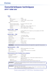 Caractéristiques techniques DTP T USW 233 Vidéo VGA Gain ���������������������������������������� Unitaire Bande passante ���������������������� 170 MHz (‑3 dB) Diaphonie �������������������������������� -50 dB à 10 MHz, -30 dB à 100 MHz Vitesse de commutation ���������� <5 ms (max.) HDMI Débit de données maximal ������ 6,75 Gb/s (2,25 Gb/s par couleur) Horloge de pixels maximale ����� 165 MHz Résolution ������������������������������� Jusqu'à 1920 x 1200 ou 1080p à 60 Hz ; 2K Formats ����������������������������������� Vidéo numérique YCbCr et RVB Standards�������������������������������� DVI 1.0, HDMI, HDCP 1.1, CEA-861E Entrée vidéo — HDMI Nombre/type de signal ������������������� 2 entrées HDMI (ou DVI-D single-link, avec les adaptateurs DVI-HDMI appropriés) Connecteurs ���������������������������������� 2 HDMI femelles de type A Entrée vidéo — VGA Nombre/type de signal ������������������� Connecteurs ���������������������������������� Niveau nominal ������������������������������ Niveau min./max. ��������������������������� Impédance������������������������������������� Fréquence horizontale �������������������� Fréquence verticale ������������������������ Perte par réflexion �������������������������� 1 VGA-QXGA; RGBHV 1 HD 15 broches femelle 0,7 Vpp Analogique, 0,3 V à 1,5 Vpp sans décalage 75 Ω 15 kHz à 145 kHz 30 Hz à 170 Hz <‑40 dB à 5 MHz REMARQUE: L'entrée VGA est numérisée et transmise comme signal DTP. Le signal VGA n'est pas scalé. Synchronisation — VGA Type d'entrée ��������������������������������� Niveau d'entrée ������������������������������ S/B ������������������������������������������������ Tension d'entrée max. �������������������� RVBHV, synchronisation à 2 et 3 niveaux 1,9 V à 5,0 Vpp >90 dB, à l'entrée maximum (non pondérée) 5,0 Vpp Interconnexion entre l'émetteur et le récepteur Nombre/type de signal ������������������� Connecteur ������������������������������������ Standard de raccordement ������������ Distance de transmission ��������������� 1 sortie DTP 230 1 RJ-45 femelle TIA/EIA T568B Jusqu'à 70 m (230') avec un câble paires torsadées blindées ou le câble XTP DTP 24 Câble requis ���������������������������� Conducteur solide, 24 AWG ou plus Câble recommandé ����������������� Bande passante 400 MHz, paires torsadées blindées (STP) REMARQUE: Le câble paires torsadées blindées XTP DTP 24 Extron est fortement recommandé pour une performance optimale. REMARQUE: Signaux en mode entrée et sortie : DTP : HDMI avec audio embeddé, audio analogique, RS‑232 et IR, et alimentation à distance HDBT : HDMI avec audio embeddé ainsi que RS‑232 et IR Émetteur sur paires torsadées DTP T USW 233 Extron • Caractéristiques techniques 1 Caractéristiques techniques • DTP T USW 233 (suite) Audio Gain ����������������������������������������������� Réponse en fréquence ������������������� THD + Bruit������������������������������������ S/B ������������������������������������������������ Diaphonie �������������������������������������� Espacement des canaux stéréo ����� Sortie asymétrique : 0 dB ; Sortie symétrique : +6 dB 20 Hz à 20 kHz, ±0,5 dB 0,01% à 1 kHz au niveau nominal >90 dB, à l'entrée maximum (non pondérée) <-45 dB @ 20 kHz, ou -72 dB @ 1 kHz ou en dessous >80 dB à 1 kHz à 20 kHz Entrée audio Nombre/type de signal ������������������� 1 stéréo analogique, asymétrique ou 2 audio numérique, embeddé dans le signal HDMI Connecteurs ���������������������������������� 1 mini-jack stéréo 3,5 mm femelle 2 HDMI femelle de type A (partagé avec entrée vidéo) Formats source HDMI ��������������������������������������� LPCM jusqu'à 7.1/24 bits/192 kHz, Dolby TrueHD, Dolby Digital Plus, Dolby Digital EX, Dolby Digital 5.1, Dolby Digital 2/0 Surround, Dolby Digital 2/0, DTS-HD Master Audio, DTS-HD, DTS-ES Discrete 6.1, DTS-ES Matrix 6.1, DTS Digital Surround 5.1, DT