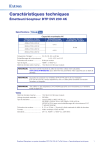 Caractéristiques techniques Émetteur/récepteur DTP DVI 230 4K Spécifications Capacités maximales 4K Résolution et taux de rafraîchissement 4096 x 2160 à 30 Hz 3840 x 2160 à 30 Hz 4096 x 2160 à 60 Hz 3840 x 2160 à 60 Hz Échantillonnage de la chrominance Profondeur de bits maximale par couleur 4:4:4 8 bits 4:2:0 Fréquences d'images¹ ������������������� 24, 25, 30, 50, ou 60 ips Échantillonnage de la chrominance¹ 4:4:4, 4:2:2, ou 4:2:0 Profondeur de couleurs¹ ���������������� 8 bits par couleur Type de signal �������������������������������� HDMI 1.4, HDCP 2.3 Débit de données vidéo maximal ��� 10,2 Gb/s (3,4 Gb/s par couleur) REMARQUE: ¹Soumis à la limite maximale du débit de données. Utilisez notre calculateur (www.extron.fr/8Kdatarate) pour déterminer les paramètres vidéo supportés par ce débit de données. REMARQUE: Ce produit se compose d'un émetteur (DTP DVI 4K 230 Tx) et d'un récepteur (DTP DVI 4K 230 Rx), vendus séparément, avec un câble paires torsadées connectant l'émetteur au récepteur. REMARQUE: *Des câbles ou des adaptateurs DVI-D/HDMI appropriés sont nécessaires pour l'entrée/la sortie du signal DVI. Vidéo Débit de données maximal ������������� 10,2 Gb/s (3,4 Gb/s par couleur) Horloge de pixels maximale ����������� 300 MHz Type de résolution �������������������������� Jusqu'à 2560 x 1600* à 60 Hz, ou 4K (4096 x 2160) à 30 Hz, UHD (3840 x 2160) à 30 Hz, 4K/UHD à 60 Hz avec sous-échantillonnage de la chrominance 4:2:0 (* reduced blanking) Profondeur de couleurs ������������������ 8, 10, ou 12 bits — Soumis à la limite maximale du débit de données Formats ����������������������������������������� Vidéo numérique YCbCr et RVB Standards �������������������������������������� DVI 1.0, HDMI 1.4, HDCP 2.3, CEA-861E Émetteur/Récepteur sur paires torsadées DTP DVI 230 4K Tx/Rx Extron • Caractéristiques techniques 1 Caractéristiques techniques • Émetteur/récepteur DTP DVI 230 4K (suite) Entrée vidéo — Émetteur Nombre/type de signal ������������������� 1 DVI-D single-link (ou HDMI*) 1 DVI-D single-link (ou HDMI*) local en sonde Connecteurs ���������������������������������� 2 DVI-I femelles Interconnexion entre l'émetteur et le récepteur Connecteurs ���������������������������������� 1 RJ‑45 femelle par unité Standard de raccordement ������������ TIA/EIA T568B Distance de transmission du signal 1080p à 60 Hz ������������������������ Jusqu'à 70 m (230') avec un câble paires torsadées blindées (STP) ou le câble XTP DTP 24 2560 x 1600 à 60 Hz ��������������� Jusqu'à 40 m (130') avec un câble paires torsadées blindées (STP) ou le câble XTP DTP 24 4K/UHD à 30 Hz et 60 Hz ������� Jusqu'à 40 m (130') avec un câble paires torsadées blindées (STP) ou le câble XTP DTP 24 Câble requis����������������������������������� Conducteur solide, 24 AWG ou plus Câble recommandé ����������������������� Bande passante 400 MHz, paires torsadées blindées (STP) REMARQUE: Le câble paires torsadées blindées XTP DTP 24 Extron est fortement recommandé pour une performance optimale. Sortie vidéo — Récepteur Nombre/type de signal ������������������� 1 DVI‑D single‑link (ou HDMI*) Connecteurs ���������������������������������� 1 DVI-I femelle Audio Gain ����������������������������������������������� Réponse en fréquence ������������������� THD + Bruit������������������������������������ S/B ������������������������������������������������ Espacement des canaux stéréo ����� Sortie asymétrique : 0 dB ; Sortie symétrique : +6 dB 20 Hz à 20 kHz, ±0,5 dB 0,03%, 20 Hz à 20 kHz au niveau de sortie maximal >90 dB, à la sortie maximum (15 dBu), symétrique (non pondéré) >80 dB à 1 kHz à 20 kHz Entrée audio Nombre/type de signal ������������������� 1 stéréo niveau PC, asymétrique REMARQUE: L'audio analogique n'est pas embeddé sur le signal vidéo numérique. L'audio numérique embeddé n'est pas désembeddé depuis le signal vidéo numérique. Connecteurs ���������������������������������� Impédance������������������������������������� Niveau nominal ������������������������������ Niveau maximal������������������������������ 1 jack stéréo 3,5 mm, 2 canaux ; pointe (G), anneau (D), manchon (masse) >10 k Ω asymétrique, couplée cc -10 dBV (316 mVrms) +7 dBV (asymétrique) REMARQUE: 0 dBu = 0,775 Vrms, 0 dBV = 1 Vrms, 0 dBV ≈ 2 dBu Sortie audio Nombre/type de signal 