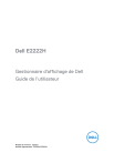 Dell E2222H Gestionnaire d'affichage de Dell Guide de l’utilisateur Modèle de moniteur : E2222H Modèle réglementaire : E2222Ht/E2222Hf REMARQUE : Une REMARQUE indique des informations importantes qui vous aident à mieux utiliser votre ordinateur. © 2021 Dell Inc. ou ses filiales. Tous droits réservés. Dell, EMC et les autres marques commerciales sont des marques commerciales de Dell Inc. ou de ses filiales. Les autres marques commerciales peuvent être des marque de commerce de leurs propriétaires respectifs. 2021 - 11 Rév. A00 2 │ Contenu Aperçu........................................................................4 Utiliser la boîte de dialogue Réglages rapides................ 5 Régler les fonctions basiques d'affichage.......................7 Assigner des Modes prédéfinis à des applications...........8 Organisation de Windows avec Easy Arrange ................ 9 Gérer plusieurs entrées vidéo...................................... 12 Restauration des positions des applications................. 14 Attacher DDM aux fenêtres actives (Windows 10 uniquement).............................................................. 16 Appliquer les fonctionnalités d'économie d'énergie....... 17 Autres touches de raccourcis...................................... 17 Guide de dépannage................................................... 18 Contenu │ 3 Aperçu Le Gestionnaire d'affichage Dell est une application pour Microsoft Windows utilisée pour gérer un moniteur ou un groupe de moniteurs. Elle permet de régler manuellement l'image affichée, d'attribution des réglages automatiques, d'utiliser la gestion de l'énergie, d’organiser les fenêtres, de tourner l'image , et d'autres caractéristiques sur certains moniteurs Dell. Après l’installation, le Gestionnaire d'affichage Dell est lancé à chaque démarrage du système et son icône apparaît dans la zone de notification. Des informations sur les moniteurs connectés au système sont disponibles lorsque vous mettez le pointeur de la souris au-dessus de l'icône de la zone de notification. REMARQUE : Dell Display Manager utilise le canal DDC/CI pour communiquer avec votre moniteur. Assurez-vous que DDC/CI est activé dans le menu comme ci-dessous. Moniteur Dell 22 Luminosité/Contraste Afficher les infos Réglage auto DDC/CI Marche Source d'entrée Traitement LCD Eteint Couleur Numéro de service Affichage Réinitialiser autres Menu Réinitialisation d’usine Personnaliser Autres 4 │ Aperçu Utiliser la boîte de dialogue Réglages rapides Cliquez sur l'icône Gestionnaire d'affichage Dell dans la zone de notification pour ouvrir la boîte de dialogue Réglages rapides. Lorsque plusieurs modèles Dell supportés sont connectés à l’ordinateur, un moniteur cible spécifique peut être sélectionné en utilisant le menu. La boîte de dialogue Réglages rapides permet un réglage pratique des niveaux de luminosité et de contraste du moniteur. Vous pouvez sélectionner le Mode manuel ou le Mode auto, et la résolution de l'écran peut être modifiée. La boîte de dialogue Réglages rapides permet aussi d'accéder à l'interface d'utilisateur avancée du Gestionnaire d'affichage Dell, qui permet de régler les fonctions basiques, de configurer le mode auto et d'accéder à d'autres fonctions. Utiliser la boîte de dialogue Réglages rapides │ 5 REMARQUE : Caractéristique Fonction Description Accès rapide Touche de au DDM raccourci pour appeler l'interface utilisateur de DDM • Ctrl+Maj+D • Utilisez la touche Page haut / Page bas ou cliquez sur « > » pour tout parcourir toutes les dispositions Easy Arrange. Contrôler un moniteur individuel dans une configuration à plusieurs moniteurs • D ans la liste déroulante de choix du moniteur, le moniteur sélectionné affiche le logo Dell. • Utilisez la fonction de test automatique du moniteur. • Déplacez l'interface utilisateur de DDM vers le moniteur à contrôler. • Appuyez sur Ctrl+Maj+D pour faire apparaître la mini interface utilisateur (miniUI) sous le pointeur de la souris. 6 │ Utiliser la boîte de dialogue Réglages rapides Régler les fonctions basiques d'affichage Vous pouvez sélectionner Mode manuel qui vous permet de choisir manuellement un mode prédéfini ou de choisir Mode auto qui applique un mode prédéfini basé sur l'application active. Un message à l'écran affiche le mode prédéfini actuel à chaque fois qu'il change. La Luminosité et le Contraste du moniteur sélectionné peuvent aussi être réglés directement à partir de l'onglet Basique. REMARQUE : Lorsque plusieurs moniteurs Dell sont connectés, sélectionnez « Activer le contrôle de la matrice d'affichage » afin d’appliquer les commandes prédéfinies de luminosité, de contraste et de couleurs à tous les moniteurs. Régler les fonctions basiques d'affichage │ 7 Assigner des Modes prédéfinis à des applications L'onglet Mode auto vous permet d'associer un Mode prédéfini spécifique à une application spécifique, et de l'appliquer automatiquement. Lorsque le Mode auto est activé, le Gestionnaire d'affichage Dell passe automatiquement au Mode prédéfini correspondant à chaque fois que l'application associée est activée. Le Mode prédéfini affecté à une application spécifique peut être le même sur chaque moniteur connecté, ou il peut varier d'un moniteur à l'autre. Le Gestionnaire d'affichage Dell est préconfiguré pour de nombreuses applications populaires. Pour ajouter une nouvelle application à la liste d'assignation, il vous suffit de faire glisser l'application depuis le bureau, le menu Démarrer de Windows ou ailleurs, et de la déposer sur la liste actuelle. REMARQUE : Les affectations de Mode prédéfini pour des fichiers batch, des scripts et des programmes de chargement, ainsi que des fichiers non exécutables tels que des archives zip ou des fichiers compressés, ne sont pas prises en charge. Vous pouvez également configurer le 