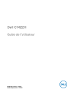 Dell C1422H Guide de l’utilisateur Modèle de moniteur : C1422H Modèle réglementaire : C1422Hf Remarques, Attentions et Avertissements REMARQUE : Une REMARQUE indique des informations importantes qui vous aident à mieux utiliser votre ordinateur. ATTENTION : ATTENTION indique des dommages potentiels au matériel ou une perte de données si les instructions ne sont pas suivies. AVERTISSEMENT : Un AVERTISSEMENT indique un risque de dommages matériels, de blessures corporelles ou de mort. Copyright © 2021 Dell Inc. ou ses filiales. Tous droits réservés. Dell, EMC et les autres marques commerciales appartiennent à Dell Inc. ou à ses filiales. Les autres marques commerciales peuvent être des marque de commerce de leurs propriétaires respectifs. 2021 - 08 Rév. A00 Contenu À propos de votre moniteur.................................5 Contenu de l’emballage.............................................. 5 Caractéristiques du produit........................................ 6 Fonctionnalités et commandes.................................... 7 Spécifications du moniteur......................................... 9 Affectation des broches.............................................14 Capacité Plug and Play...............................................15 Qualité du moniteur LCD et politique relative aux pixels défectueux................................................................15 Consignes de maintenance.........................................15 Configuration de votre moniteur......................... 16 Manchon...................................................................16 Réglage de l'inclinaison..............................................16 Brancher votre moniteur.............................................17 Connexion avec un dispositif d'accueil........................ 20 Utilisation de votre moniteur.............................. 21 Allumer le moniteur....................................................21 Utilisation de la commande du panneau avant...............21 Utilisation du menu à l'écran (OSD)............................ 23 Contenu │ 3 Régler la résolution d’affichage de votre moniteur....... 26 Guide de dépannage..........................................27 Autotest................................................................... 27 Diagnostics intégrés.................................................. 29 Problèmes courants.................................................. 30 Appendice........................................................32 Consignes de sécurité............................................... 32 Règlements FCC (E.U. uniquement) et autres réglementations..................................................................32 Contacter Dell.......................................................... 32 Base de données européenne pour les labels d’énergie et spécifications du produit....................................... 32 4 │ Contenu À propos de votre moniteur Contenu de l’emballage Votre moniteur est livré avec les composants indiqués dans le tableau. Assurez-vous d’avoir reçu tous les composants et Contacter Dell qu’aucun élément ne manque. REMARQUE : Certains éléments sont en option et peuvent ne pas être fournis avec votre moniteur. Certaines fonctionnalités peuvent ne pas être disponibles dans certains pays. Image des composants Description des composants Affichage Câble USB Type C (C vers C) Manchon • Guide de démarrage rapide • Informations sécuritaires et réglementaires À propos de votre moniteur │ 5 Caractéristiques du produit Le moniteur Dell C1422H dispose d’une dalle à cristaux liquides (LCD), à matrice active, à transistors en couche mince (TFT), d’un traitement antistatique et d’un rétroéclairage à LED. Les caractéristiques du moniteur incluent : • Une zone d’affichage visible d’une diagonale de 35,56 cm (14,0 pouces) (mesurée en diagonale), une résolution de 1920 x 1080, avec la prise en charge du plein écran pour les résolutions inférieures • Angles de vue de 178 degrés en orientation verticale et horizontale • Taux de contraste dynamique (700:1). • Connectivité numérique avec USB Type-C • Le double port USB Type-C prend en charge le mode DP alternatif DP, le passage de l'alimentation et la fourniture de l'alimentation 65 W • Capacité de réglage d’inclinaison • Prêt-à-l’emploi si pris en charge par votre ordinateur • Réglages OSD pour la configuration et l’optimisation aisées de l’écran • ≤ 0,3 W en mode de veille • Optimisez le confort oculaire avec ComfortView • Verre sans arsenic et sans mercure (panneau) • Faible teneur en BFR/PVC (les circuits imprimés à l’intérieur du moniteur sont constitués de matériaux stratifiés sans BFR/PVC) • Conforme RoHS • Enregistré EPEAT le cas échéant. L'enregistrement EPEAT varie selon les pays Voir https://www.epeat.net pour l’état d'enregistrement par pays • Certifié Energy Star®. ATTENTION : Les effets potentiels à long terme des émissions de lumière bleue provenant du moniteur peuvent endommager les yeux, avec de la fatigue oculaire, de la tension oculaire numérique et ainsi de suite. La fonction ComfortView est conçue pour réduire la quantité de lumière bleue émise par le moniteur pour optimiser le confort visuel. 6 │ À propos de votre moniteur Fonctionnalités et commandes 1 ÉtiDescription quette 1 2 3 4 Bouton Marche/Arrêt alimentation (avec voyant LED) USB Type C (prend en charge le mode Alt DP 1.2 et la fonction PD) Boutons de fonction 2 3 4 Utilisation Allumer/éteindre le moniteur. Un voyant blanc constant indique que le moniteur est allumé et fonctionne normalement. Un voyant blanc clignotant indique que le moniteur est en Mode de veille Connectez votre ordinateur portable / téléphone avec un câble USB de type C (C vers C). Remarque : Données USB non prises en charge. Pour accéder au menu OSD et changer les paramètre