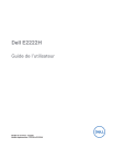 Dell E2222H Guide de l’utilisateur Modèle de moniteur : E2222H Modèle réglementaire : E2222Ht/E2222Hf Remarques, Attentions et Avertissements REMARQUE : Une REMARQUE est une information importante qui vous aidera à mieux utiliser votre ordinateur. ATTENTION : Une ATTENTION signale des dommages potentiels au matériel ou une perte de données si les instructions ne sont pas suivies. ATTENTION : Un AVERTISSEMENT indique un risque de dommages matériels, de blessures corporelles ou de mort. Copyright © 2021 Dell Inc. ou ses filiales. Tous droits réservés. Dell, EMC et les autres marques de commerce de Dell Inc. ou de ses affiliés. Les autres marques commerciales peuvent être des marque de commerce de leurs propriétaires respectifs. 2021 - 11 Rév. A00 Contenu À propos de votre moniteur.................................5 Contenu de l’emballage.............................................. 5 Caractéristiques du produit........................................ 6 Fonctionnalités et commandes.................................... 7 Affectation des broches.............................................15 Capacité Plug and Play...............................................17 Qualité du moniteur LCD et politique relative aux pixels défectueux .....................................................17 Consignes de maintenance.........................................17 Configuration de votre moniteur......................... 18 Raccord au support....................................................18 Brancher votre moniteur.............................................19 Organisation des câbles............................................. 20 Retrait du support.....................................................21 Utilisation de votre moniteur..............................23 Allumer le moniteur................................................... 23 Utilisation des commandes du panneau avant.............. 23 Utilisation du menu à l'écran (OSD)............................ 28 Régler la résolution d’affichage de votre moniteur........41 Inclinaison ............................................................... 43 Contenu │ 3 Guide de dépannage..........................................44 Autotest................................................................... 44 Diagnostics intégrés.................................................. 45 Problèmes courants.................................................. 46 Problèmes spécifiquement liés aux produit.................. 48 Appendice........................................................49 Règlements FCC (E.U. uniquement) et autres réglementations .......................................................49 Contacter Dell.......................................................... 49 Base de données européenne pour les labels d’énergie et spécifications du produit....................................... 49 4 │ Contenu À propos de votre moniteur Contenu de l’emballage Votre moniteur est livré avec les composants indiqués dans le tableau. Assurez-vous d’avoir reçu tous les composants et Contacter Dell qu’aucun élément ne manque. REMARQUE : Certains éléments sont en option et peuvent ne pas être fournis avec votre moniteur. Certaines fonctionnalités peuvent ne pas être disponibles dans certains pays. REMARQUE : Pour installer le support à partir d'une autre source quelle qu’elle soit, consultez la documentation fournie avec le support. Image des composants Description des composants Affichage Colonne du socle Base du socle Vis mère VESA™ Câble d'alimentation (peut différer selon le pays) À propos de votre moniteur │ 5 Câble VGA (EMEA et Japon) Câble DP • Guide de démarrage rapide • Informations de sécurité, de l'environnement et règlementaires Caractéristiques du produit Le moniteur à écran plat Dell E2222H comporte une matrice active, un transistor à couches minces (TFT) et un écran à cristaux liquides (LCD) à rétroéclairage LED. Caractéristiques du moniteur : • Zone d’affichage visible diagonale de 54,48 cm (21,45 pouces) (mesurée diagonalement). Résolution de 1920 x 1080, avec prise en charge plein écran pour les basses définitions. • Angles de vue larges 178 degrés en orientations verticales et horizontales. • Taux de contraste (3000:1). • Connectivité digitale avec DisplayPort. • Prêt-à-l’emploi (Plug and play) si pris en charge par votre ordinateur. • Réglages OSD pour la configuration et l’optimisation aisées de l’écran. • ≤ 0,3 W en mode de veille • Optimisez le confort visuel avec un écran sans scintillements. • Le moniteur est doté de la technologie flicker-flee, qui élimine les clignotements visibles à l'œil nu, procure une expérience de visionnage agréable et évite aux utilisateurs la tension et la fatigue oculaires. • Les possibles effets à long terme des émissions de lumière bleue du moniteur peuvent causer des dommages oculaires, y compris la fatigue oculaire et la tension oculaire numérique. La fonctionnalité ComfortView réduit le risque de tension oculaire due aux émissions de lumière bleue. • Logement antivol pour câble • Verre sans arsenic et sans mercure (panneau uniquement). • Faible teneur en BFR/PVC (est constituée de matériaux stratifiés sans BFR/PVC). • Répond aux normes de courant de fuite NFPA 99. • Certifié TCO. • Enregistré EPEAT le cas échéant. L'enregistrement EPEAT varie selon les pays. Consultez https://www.epeat.net pour enregistrer le statut en fonction du pays. • Conforme à la norme RoHS • Certifié Energy Star®. 6 │ À propos de votre moniteur Fonctionnalités et commandes Vue de face ÉtiDescription quette Boutons de fonction 1 2 Bouton Marche/Arrêt alimentation (avec voyant LED) Utilisation Pour accéder au menu OSD et changer les paramètres si nécessaire. Pour plus d'informations, voir Utilisation des commandes du panneau avant. Allumer/éteindre le moniteur