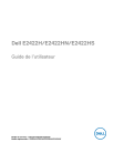 Dell E2422H/E2422HN/E2422HS Guide de l’utilisateur Modèle de moniteur : E2422H/E2422HN/E2422HS Modèle réglementaire : E2422Ht/E2422Hf/E2422HNf/E2422HSf Remarques, Attentions et Avertissements REMARQUE : Une REMARQUE est une information importante qui vous aidera à mieux utiliser votre ordinateur. ATTENTION : Une ATTENTION signale des dommages potentiels au matériel ou une perte de données si les instructions ne sont pas suivies. ATTENTION : Un AVERTISSEMENT indique un risque de dommages matériels, de blessures corporelles ou de mort. Copyright © 2021 Dell Inc. ou ses filiales. Tous droits réservés. Dell, EMC et les autres marques de commerce de Dell Inc. ou de ses affiliés. Les autres marques commerciales peuvent être des marque de commerce de leurs propriétaires respectifs. 2021 - 07 Rév. A00 Contenu À propos de votre moniteur.................................5 Contenu de l’emballage.............................................. 5 Caractéristiques du produit........................................ 6 Fonctionnalités et commandes.................................... 7 Affectation des broches.............................................19 Capacité Plug and Play.............................................. 22 Qualité du moniteur LCD et politique relative aux pixels défectueux ............................................................. 22 Consignes de maintenance........................................ 22 Configuration de votre moniteur.........................23 Raccord au support................................................... 23 Brancher votre moniteur............................................ 25 Organisation des câbles............................................. 26 Retrait du support.................................................... 27 Utilisation de votre moniteur..............................30 Allumer le moniteur................................................... 30 Utilisation des commandes du panneau avant.............. 30 Utilisation de la fonction de verrou OSD...................... 32 Utilisation du menu à l'écran (OSD)............................ 36 Régler la résolution d’affichage de votre moniteur....... 56 Contenu │ 3 Inclinaison................................................................ 58 Guide de dépannage..........................................59 Autotest................................................................... 59 Diagnostics intégrés...................................................61 Problèmes courants.................................................. 62 Problèmes spécifiquement liés aux produit.................. 64 Appendice........................................................65 Règlements FCC (E.U. uniquement) et autres réglementations..................................................................65 Contacter Dell.......................................................... 65 Base de données européenne pour les labels d’énergie et spécifications du produit....................................... 65 4 │ Contenu À propos de votre moniteur Contenu de l’emballage Votre moniteur est livré avec les composants indiqués dans le tableau. Assurez-vous d’avoir reçu tous les composants et Contacter Dell qu’aucun élément ne manque. REMARQUE : Certains éléments sont en option et peuvent ne pas être fournis avec votre moniteur. Certaines fonctionnalités peuvent ne pas être disponibles dans certains pays. REMARQUE : Pour installer le support à partir d'une autre source quelle qu’elle soit, consultez la documentation fournie avec le support. Image des composants Description des composants Affichage a a b b Colonne du socle : a. E2422H/E2422HN b. E2422HS Base du socle : a. E2422H/E2422HN b. E2422HS Vis mère VESA™ Câble d'alimentation (peut différer selon le pays) Câble VGA (EMEA et Japon) À propos de votre moniteur │ 5 Câble DP (E2422H) Câble HDMI (E2422HN et E2422HS) • Guide de démarrage rapide • Informations de sécurité, de l'environnement et règlementaires Caractéristiques du produit Le moniteur à écran plat Dell E2422H/E2422HN/E2422HS comporte une matrice active, un transistor à couches minces (TFT) et un écran à cristaux liquides (LCD) à rétroéclairage LED. Caractéristiques du moniteur : • E2422H/E2422HN/E2422HS : Zone d’affichage visible diagonale de 60,47 cm (23,8 po.) (mesurée diagonalement). Résolution de 1920 x 1080, avec prise en charge plein écran pour les basses définitions. • Angles de vue larges 178 degrés en orientations verticales et horizontales. • Taux de contraste (1000:1). • Connectivité digitale avec DisplayPort ou HDMI. • Capacité de réglage de la hauteur pour le E2422HS. • Doubles enceintes intégrées pour le E2422HS. • Prêt-à-l’emploi (Plug and play) si pris en charge par votre ordinateur. • Réglages OSD pour la configuration et l’optimisation aisées de l’écran. • ≤ 0,3 W en mode de veille • Optimisez le confort visuel avec un écran sans scintillements. • Le moniteur est doté de la technologie flicker-flee, qui élimine les clignotements visibles à l'œil nu, procure une expérience de visionnage agréable et évite aux utilisateurs la tension et la fatigue oculaires. • Les possibles effets à long terme des émissions de lumière bleue du moniteur peuvent causer des dommages oculaires, y compris la fatigue oculaire et la tension oculaire numérique. La fonctionnalité ComfortView réduit le risque de tension oculaire due aux émissions de lumière bleue. • Logement antivol pour câble • Verre sans arsenic et sans mercure (panneau uniquement). • Faible teneur en BFR/PVC (est constituée de matériaux stratifiés sans BFR/PVC). • Répond aux normes de courant de fuite NFPA 99. • Écran certifié TCO. • Enregistré EPEAT le cas échéant. L'enregistrement EPEAT varie selon les pays. Consultez https://www.epeat.net pour enregistrer le statut en fonction du pays. • Conforme 