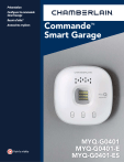Présentation Configurer la commande Smart Garage Besoin d’aide? Accessoires et pièces Voir la vidéo Commande™ Smart Garage MYQ-G0401 MYQ-G0401-E MYQ-G0401-ES Présentation Contenu de la boîte Caractéristiques techniques Présentation Contenu de la boîte Se familiariser avec la commande Smart Garage Boutons et DEL Configurer la commande Smart Garage Besoin d’aide? Capteur de porte MYQ-G0402 Accessoires et pièces Concentrateur Bandes Velcro Adaptateur d’alimentation Plaque de montage . Vis pour capteur de porte Ancrages et vis pour concentrateur Affichette d’avertissement Caractéristiques techniques • Garage intelligent™ La commande peut commander jusqu’à deux ouvre-portes de garage (exige un second capteur vendu séparément, voir Accessoires et pièces.) • La commande Smart Garage peut commander jusqu’à 16 accessoires myQ®. • Températures de service : -20° à 65° °C (-4° à 149° °F) • Réservé à un usage avec portes de garage articulées. • La porte du garage DOIT être équipée de capteurs de sécurité. • La commande Smart Garage n’est PAS compatible avec des actionneurs de barrière. 2 Présentation Contenu de la boîte Caractéristiques techniques Présentation Se familiariser avec la commande Smart Garage Se familiariser avec la commande Smart Garage La commande Smart Garage permet de commander jusqu’à deux ouvreportes de garage, et 16 dispositifs à partir de l’appli myQ. Boutons et DEL Voir Accessoires et pièces. Configurer la commande Smart Garage Ouvre-porte de garage Besoin d’aide? Accessoires et pièces Lampe à DEL télécommandée Appareils de commande à partir de l’appli myQ Concentrateur Capteur de porte Télécommande d’éclairage Télécommande d’éclairage 3 Présentation Contenu de la boîte Caractéristiques techniques Présentation Boutons et DEL Se familiariser avec la commande Smart Garage DEL verte Boutons et DEL Témoin de connexion®Wi-Fi Voir Voyants à DEL Configurer la commande Smart Garage Besoin d’aide? Accessoires et pièces DEL ambre DEL bleue Témoin d’appariement du capteur de portevoir Voyants à DEL Témoin lumineux d’alimentation et de paramètresvoir Voyants à DEL DEL rouge Témoin d’état de charge de la pilevoir Tester la pile du capteur de porte Concentrateur Capteur de porte MYQ-G0402 Bouton de test Bouton de porte 2 Bouton ( ) de réglages Bouton de porte 1 4 Présentation Configurer la commande Smart Garage Configurer la commande Smart Garage Ce qu’il vous faudra • Accéder à votre ouvre-porte de garage compatible, vérifier la compatibilité de l’ouvre-porte par fabricant Connecter la commande Smart Garage • Un puissant signal Wi-Fi dans le garage, voir Vérifier votre signal Wi-Fi Vérifier votre signal Wi-Fi • Le mot de passe de votre réseau Wi-Fi résidentiel Apparier le capteur de porte au concentrateur • Une échelle Monter le capteur de porte • Une perceuse 5/32 po Choisir l’emplacement du concentrateur • Un tournevis cruciforme Monter le concentrateur • Bluetooth activé sur votre téléphone mobile Ce qu’il vous faut Vidéo d’assistance Connecter la commande Smart Garage Ajouter des partenaires et accessoires intelligents myQ Besoin d’aide? Accessoires et pièces 1. Télécharger l’application myQ. Si l’appli a déjà été installée, s’assurer d’avoir la plus récente version de manière à optimiser l’expérience myQ. 2. Créer un compte et se connecter. 3. Toucher (+) pour ajouter la commande Smart Garage. L’appli vous guidera dans l’installation et la connexion de la commande Smart Garage et vous montrera comment : a. Apparier le capteur de porte au concentrateur. b. Monter le capteur de porte. c. Apparier le concentrateur à l’ouvre-porte de garage. d. Monter le concentrateur Félicitations! L’installation de votre commande Smart Garage Control est maintenant terminée. App Store et les logos Apple et App Store sont des marques de commerce d’Apple Inc. Google Play et le logo Google Play sont des marques de commerce de Google Inc. 5 Présentation Configurer la commande Smart Garage Ce qu’il vous faut Configurer la commande Smart Garage Vérifier votre signal Wi-Fi Vérifier que votre appareil mobile est connecté à votre réseau Wi-Fi. Tenir l’appareil là où l’on compte monter le concentrateur. Connecter la commande Smart Garage Zone de montage du concentrateur Vérifier votre signal Wi-Fi Apparier le capteur de porte au concentrateur Monter le capteur de porte Choisir l’emplacement du concentrateur Monter le concentrateur Vidéo d’assistance Ajouter des partenaires et accessoires intelligents myQ 1,83 m (6 pi) Besoin d’aide? 1,83 m (6 pi) 1,83 m (6 pi) Accessoires et pièces Si on voit : Le signal Wi-Fi est puissant. Voilà! Passer à la prochaine étape. Le signal Wi-Fi est faible. Il est possible que le concentrateur n'arrive pas à se connecter pas à votre réseau Wi-Fi. S’il est impossible d’établir la connexion, voirComment améliorer la puissance du signal Wi-Fi. Aucun signal Wi-Fi. Voir la section Comment améliorer la puissance du signal Wi-Fi. 6 Présentation Configurer la commande Smart Garage Ce qu’il vous faut Connecter la commande Smart Garage Vérifier votre signal Wi-Fi Apparier le capteur de porte au concentrateur Configurer la commande Smart Garage Apparier le capteur de porte au concentrateur L’appli myQ appariera le capteur de porte au concentrateur pendant la configuration initiale. Apparier un second capteur de porte Pour ajouter un capteur de porte à un second ouvre-porte de garage, toucher (+) dans l’appli myQ pour ajouter un capteur de porte. Suivre les instructions dans l’appli. Monter le capteur de porte Apparier un capteur de porte de rechange Choisir l’emplacement du concentrateur Pour remplacer un capteur de porte existant, suivre les étapes ci-dessous. Monter le concentrateur Vidéo d’assistance Ajouter des partenaires et accessoires intelligen