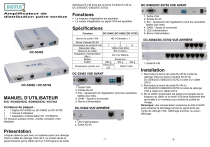 identiques RJ-45 émis par la borne d’entrée RJ-45 du DC-53402/DC-53602/DC-53702. Amplificateur de distribution paire tordue Fonctions La longueur d’égalisation est ajustable. Le niveau d’égalisation su signal VGA est ajustable. Spécifications DC-53402 Fonction DC-53402 DC-53602 DC-53702 Borne de sortie VGA HD-15 femelle x 1 Borne d’entrée RJ-45 Connecteur de sortie RJ-45 Résolution Max. Distance du câble Adaptateur d’alimentation (Min.) Boîtier PoiDC 1 1 4 8 1280x1024 60Hz 300 m (Max.) Dimensions (Lxlxh) mm 285 g 130x110.5 x25 Aluminium 322 g 340 g DC-53402/DC-53602/DC-53702 Contenus du paquet - DC-53402 VUE ARRIÈRE 1 Digitus DC-53402 ou DC-53602 ou DC-53702 1 manuel d’utilisateur 1 adaptateur d’alimentation DC 12V/600mA S’il manque quelque chose, veuillez contacter votre détaillant. DC-53602/DC-53702 VUE ARRIÈRE 1. Sortie RJ-45 200x111x25 1. Sortie VGA 2. Entrée RJ-45 3. EQ – Ajustement de l’égalisation (rend les caractères faibles plus nets) 4. GAIN – Ajuste la luminosité 5. Borne d’alimentation MANUEL D’UTILISATEUR 1. Sortie VGA 2. Entrée RJ-45 3. EQ – Ajustement de l’égalisation (rend les caractères faibles plus nets) 4. GAIN – Ajuste la luminosité 5. LED d’alimentation 6. Borne d’alimentation DC 12V 600mA DC-53402 VUE AVANT DC-53602 / DC-53702 DC-53602/DC-53702 VUE AVANT Installation 1. Raccordez la borne de sortie RJ-45 de l’unité de rallonge VGA à la borne d’entrée RJ-45 du DC-53402/DC-53602/DC-53702 à l’aide d’un câble CAT.5. 2. Raccordez la borne de sortie RJ-45 du DC-53402/DC-53602/DC-53702 à l’unité de rallonge VGA à l’aide d’un câble CAT.5. 3. EQ et GAIN compensent les pertes provoquées par la longueur du câble, et la sortie VGA peut facilement être raccordée à un moniteur pour évaluer la qualité de l’image. Remarque: Une compensation excessive du EQ et GAIN peut entraîner le décodage erroné du signal émis par l’unité de rallonge VGA, l’affichage anormal, ou aucun affichage. 1. LED d’alimentation 2. Sortie RJ-45 Présentation Lorsque utilisé de pair avec un système ayant une rallonge VGA un câble de rallonge VGA cat.5, ce produit divise le signal transmis par le câble cat.5 en 1/4/8 signaux de sortie -1- -2- Information de câblage et codage Identification du conducteur Paire 1 Paire 2 Paire 3 Paire 4 Distribution de pointes RJ45 5 4 1 2 3 6 7 8 Couleur pour le conducteur Blanc-Bleu Bleu Blanc-Orange Orange Blanc-Vert Vert Blanc-Brun Brun Marques de commerce: Toutes les compagnies, noms de marque et produits qui figurent dans ce manuel sont le marques de commerce ou les marques enregistrés de leurs propriétaires respectifs. -3- ">