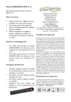 Manuel ENERGENIE SPF5-C-10 Merci beaucoup pour avoir acheter le SPF5-C-10 Mise en service: 1. 2. 3. Reliez la fiche de la réglette à prises multiples avec votre prise secteur. Connectez jusqu’à cinq appareils dans les emplacements de la réglette à prises multiples. Mettre maintenant la réglette à prises multiples sous tension en commutant l’interrupteur à bascule sur ON. Fonction d’autodiagnostic: • • Si la LED verte portant la mention «GROUNDED» est allumée, la prise multiple est correctement mise à la terre. Si la LED rouge portant la mention «PROTECTED» est allumée, la protection contre les surtensions est assurée. Consignes de Sécurité • • • • Gembird Europe B.V. Wittevrouwen 56 1358CD Almere The Netherlands http://www.gembird.nl/ [email protected] Tel. +33(0) 251404849 Prix d‘appel depuis telephone fixe Pays-Bas : 0.15 euro / min Prix d‘appel depuis telephone mobile / autre pays - selon operateur Conditions de Garantie Garantie est de 36 mois a partir de la date d’achat de l‘utilisateur final. Le talon de ga¬rantie doit énumérer clairement la date d‘achat et le type d‘appareil. Conservez le reçu d‘achat pendant toute la durée de la garantie car elle est nécessaire pour toute réclamation. Au cours de la période de garantie tous les défauts doivent être remplacé aux frais du fabricant, soit par la réparation ou la remplacement de la pièce défectueuse ou l‘ensemble du produit. Les travaux effectués sous garantie ne prolongent pas la période de garantie ni ne commencent pas une nouvelle période de garantie. Le fabricant se réserve le droit d‘annuler toute demande de garantie pour les dommages ou défauts dus à une mauvaise utilisation, abus ou les effets externes (chute, choc, pénétration de l‘eau, la poussière, etc..). Les pièces d‘usure (par exemple les piles rechargeables) 1sont exclus de la garantie. Dès réception de la marchandise sous garantie, le SAV de Gembird Europe BV se réserve le droit de choisir entre le remplacement des produits défectueux ou de délivrer un avoir. Le montant d’avoir sera toujours calculée sur la base de la valeur actuelle du marché des produits défectueux. Protéger l’appareil contre l’humidité et les salissures/ne convient qu’à une utilisation en intérieur Ne jamais raccorder plusieurs prises Déclaration de conformité multiples à la suite Ne jamais utiliser l’appareil couvert Le produit a été éprouvé et est conforme aux exigences de protection en accord avec la directive du ou emballé L’appareil n’est hors tension que conseil en rapprochant les lois des état-membres concernant les standards de produits de 2006/95/ lorsque la fi che d’alimentation est EC; 93/68/EEC et 2004/108/EC. débranchée ">