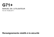 G71+ MANUEL DE L'UTILISATEUR FCC ID: YHLBLUG71+ Renseignements relatifs à la sécurité Veuillez lire attentivement les termes ci-dessous : Utiliser de façon sécuritaire Ne jamais utiliser le téléphone dans des situations où il pourrait causer un danger. Sécurité au volant Veuillez observer toutes les lois et règles de transport. Veuillez conduire avec les deux mains sur le volant. VEUILLEZ CONDUIRE DE MANIÈRE RESPONSABLE - NE JAMAIS TEXTER ET CONDUIRE Sécurité dans les hôpitaux Veuillez suivre les règles et limitations des hôpitaux. Veuillez éteindre votre téléphone mobile si vous êtes près d'appareils médicaux. Sécurité aéroportuaire N'oubliez pas de suivre les règles de sécurité des aéroports et de vol. Avertissement chimique Ne pas utiliser votre téléphone mobile près de carburants ou produits chimiques. Avertissement de température Ne jamais exposer votre téléphone à des conditions de température extrêmes. Risque lié à l'eau Votre téléphone n'est pas à l'épreuve de l'eau. Garder votre téléphone à l'abri de l'eau ou de tout autre liquide pour éviter des dommages. Appels d'urgence S'assurer que votre téléphone mobile est allumé dans une zone de service. Dans l'écran d'accueil, toucher sur la touche téléphone et composer le numéro d'urgence. Accessoires et batteries Utiliser seulement des batteries et accessoires homologués pour BLU. Sauvegarde des informations Ne pas oublier de conserver par écrit toutes les informations importantes. Sécurité de la batterie et mesures de précautions > Pour de meilleurs résultats et une meilleure autonomie de la batterie, il est recommandé de charger la batterie complétement avant d'utiliser le téléphone mobile pour la première fois. > La performance optimale d'une nouvelle batterie est généralement obtenue après deux ou trois cycles de charge complets. Note : Ne pas oublier que la surcharge continue aura des répercussions sur la durée de vie de la batterie. > Pendant la charge de la batterie, conserver le téléphone mobile hors de portée des enfants. > Garder la batterie dans un endroit frais et sec loin des rayons du soleil et de l'eau. > Ne pas exposer les piles à des températures extrêmes (inférieure à -8 °C (18 °F) ou supérieure à 43 °C (110 °F). > Cesser immédiatement d'utiliser la batterie si elle dégage une odeur, a des fissures et des fuites, une surchauffe, ou si elle est déformée ou à tout autre type de dommage physique. > Éviter d'utiliser le chargeur à proximité ou proche des liquides. Si le chargeur est en contact avec de l'eau ou n'importe quel liquide, le débrancher immédiatement afin de réduire le risque de surchauffe, de mauvais fonctionnement, de décharge électrique ou d'incendie. Déchets dangereux - Mise au rebut des batteries Avertissement : Ne pas jeter les batteries avec les déchets quotidiens incontrôlés. Le symbole retrouvé dans ce manuel indique que la batterie dans ce produit ne doit pas être mise au rebut avec les déchets quotidiens à la fin de leur durée utile. Si les batteries ne sont pas mises au rebut adéquatement, les substances qui s'y trouvent peuvent nuire à la santé humaine et à l'environnement. Veuillez-vous conformer aux lois environnementales pour disposer correctement de vos déchets. Nettoyage et Entretien - Éviter d'utiliser l'appareil et les accessoires dans des endroits trop humides pour éviter le mauvais fonctionnement. - Utiliser un chiffon doux et sec pour nettoyer l'appareil, la batterie et le chargeur. - Ne pas utiliser d'alcool, de diluant, de benzène ou tout autre solvant pour nettoyer l'appareil . Introduction Marche/Arrêt En fonction - Veuillez-vous assurer que la carte SIM est bien insérée dans le téléphone. Appuyer longuement sur la touche Marche/Arrêt pour allumer le téléphone. Hors tension - En mode veille, appuyer longuement la touche Marche/Arrêt jusqu'à ce le menu options s'affiche. Sélectionner Arrêt à partir du menu pour éteindre le téléphone. Barre de Navigation La barre de navigation est un espace dédié qui affiche des boutons de navigation de dispositif. Ces boutons de système permettent à l'utilisateur de contrôler le téléphone avec efficacité. Reculer Retourne à l'écran précédent ; Ferme du clavier, tous les programmes ouverts ou n'importe quelle option de menu. Accueil Bouton d'accueil arrête toute action en cours, puis retourne à l'écran d'accueil. Vous pouvez également accéder au tiroir d'applications, aux applications récentes et à l'application précédente. Applications Récentes Ouvre une liste d'applications récemment ouvertes qui permet de basculer facilement entre eux. Cette option peut également fermer toutes les applications ouvertes en faisant glisser sur le côté. Zone de notification La zone de notification est située sur le haut de l'écran qui contient des informations utiles et importantes concernant votre téléphone et les applications qui sont installées. Dans la zone de notification, plusieurs icônes apparaîtront comme l'indicateur de l'intensité du signal, temps, le niveau de charge de la batterie, l'indicateur de données, les indicateurs de Bluetooth et de Wi-Fi activés. Vous pouvez faire glisser la zone de notification vers le bas avec votre doigt pour afficher les notifications ou les actions en cours. Menu de paramétrage rapide (touches) Notification et Applications en cours Configuration rapide des paramètres de notification Touche effacer les notifications Configuration des paramètres de notification La fenêtre des paramètres de notification fournit des raccourcis vers différents paramètres du téléphone pour un accès rapide. Cliquer sur l'un des raccourcis de notification pour l'activer ou désactiver. Pour effacer les notifications : » Faire glisser la zone de notification vers le bas et cliquer sur l'icône Effacer les notifications situées au coin inférieur droit de l'écran. Le menu Par