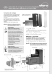 FR Instructions de montage et dimensions d'installation Moteur elero pour volets battants type KL/DMA Instructions de montage Le capot du moteur est une ouverture de révision et doit toujours être accessible ! Lors du montage du moteur pour volets battants, il est nécessaire de veiller à ce que le poids du volet battant soit supporté par le gond supérieur afin que l'entraînement « KINI » n'ait que le couple à transmettre. Il est nécessaire que le moteur et l'entraînement « KINI » soient bien vissés ou enchâssés dans le mur. Au moment de l'installation, il faut veiller à ce que le moteur et l'entraînement « KINI » soient alignés sur l'axe longitudinal et qu'ils soient en plein contact. Attention ! Veillez à ce que l'humidité ne puisse en aucun cas pénétrer dans le moteur. Avertissement! Avertissement! Tension électrique ! Danger de blessure par électrocution. Les connexions au secteur 230 V doivent être effectuées par un spécialiste autorisé. Lors de la connexion, il convient de respecter les prescriptions des entreprises de distribution d’électricité locales, ainsi que les directives pour locaux mouillés et humides selon VDE 0100. • Le moteur doit être fixé de manière à ce qu’il ne représente aucun danger pour les personnes. • Avant de l’installation du moteur, une possibilité de séparation du secteur sur tous les pôles doit exister. • Lors de l’installation des moteurs pour volets battants dans d'autres installations, l'installateur doit veiller à maintenir la conformité aux directives sur la compatibilité électromagnétique. • Veuillez respecter les caractéristiques techniques du moteur. • Veuillez respecter les instructions pour l'utilisation de commandes et de télécommandes. Exemple de calcul Le moteur sera installé dans un mur dont l'épaisseur totale est de 300 mm. La dimension « B » (196 mm) du moteur pour volets battants est donnée comme dimension fixe. Donc, la dimension « F » est de 300 mm - 196 mm = 104 mm. Le tube de protection « E » de l’arbre moteur carré « D » doit être 28 mm plus court que l’arbre moteur lui-même. Dimensions d'installation Dû aux épaisseurs différentes des murs, il est nécessaire que, lors du montage, l’arbre carré et le tube de protection de l’entraînement « KINI » soient adaptés à l’épaisseur du mur. Pour l’adaptation de ces deux, il y a la règle à calcul suivante : Dimension F de l'entraînement « KINI » = Epaisseur totale du mur – 196 mm (B) Important ! Pour le montage sous crépi, l’épaisseur minimale du mur est de 300 mm. Pour le montage partiel sous crépi, elle est de 250 à 300 mm. Danger de pincement ! Danger de blessure par pincement ! • Assurez-vous que personne ne se trouve dans la zone de déplacement des volets battants. • Assurez-vous que les volets battants ne peuvent être manœuvrés lorsque des travaux (par exemple nettoyage de fenêtres) sont effectués à proximité de ceux-ci. Entrée de câbles m n m 110 v v n m m m Y 80 b n carré 10 mm 120 n 28 v 175 F l 25 Entraînement « KINI » 85 b v 8 v l 28 E b 40 v b v b b D m 70 190 n m n n n m L'entraînement « KINI » n'est pas compris dans la livraison ! 50 m (B) 196 Instructions de montage et de réglage Moteur elero pour volets battants type KL/DMA 0 L 0 R L 0 Platine moteur de droite R Platine moteur de gauche Volet de gauche avec contreventement Couple de coupure : 15 Nm–25 Nm en continu. Un moteur est nécessaire pour chaque battant. Plusieurs moteurs peuvent être commutés ensemble en raison de l’électronique. (observez le pouvoir de coupure de l’élément de commande) L Platine moteur de droite R Fig. 2 Fig. 3 Chevauchement Überlappung Cette platine est accessible après enlèvement des deux Z capots arrières (voir figure au recto). L Déconnexion par couple + - K1 K2 R N PE T W9 W1 W2 W3 0 L R Retard de course RC Seulement pour connexions internes R W10 W8 W4 W5 W6 W7 0-R = Retard de course rotation à droite 0-L = Retard de course rotation à gauche (Vue à travers le moteur sur l'arbre) 2. Appuyez sur cette touche pendant au moins 10 secondes. Important : En cas de connexion parallèle de deux moteurs, ces derniers peuvent être remis à zéro en même temps. 0 R Le retard sans graduations permet également de réaliser un chevauchement des volets battants ouverts (voir Fig. 3). Procédure de mise à zéro 1. Raccordez les sens OUVERT et FERMÉ sur une seule touche. 3. Raccordez à nouveau le moteur pour le service (voir exemple de raccordement). L Volet de droite avec contreventement LC Important : La remise à zéro du moteur n’est nécessaire qu’avec une modification de la construction sur la course de déplacement. Platine moteur de gauche L Remise à zéro Les points programmés automatiquement pour les fins de course ou la coupure en douceur peuvent être remis à zéro. Côté extérieur N Déconnexion par l'intermédiaire du couple Le moteur dispose d'une déconnexion électronique de fin de course par l'intermédiaire du couple. Il est possible de régler le couple de déconnexion, sans graduations, à l'aide du bouton rotatif « T » qui se trouve sur la platine. La valeur augmente si le bouton est tourné dans le sens + et est réduite s'il est tourné dans le sens -. Le réglage d'usine (position centrale) correspond à une valeur standard adéquate dans la plupart des cas. Les positions de fin de course sont programmées automatiquement après une ouverture et une fermeture complètes des volets battants. Un peu avant d'atteindre les butées, le moteur ralentit sa course. Couple de déconnexion : 15 Nm - 25 Nm sans graduations. 1 moteur est nécessaire pour chacun des volets. Grâce à l'électronique, il est possible de brancher plusieurs moteurs ensemble (tenir compte de la puissance de rupture de l’automatisme). Important ! Il est important que les deux moteurs soient réglés conformément à la Fig. 2. Un retard de course est