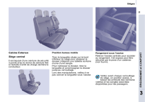 Cabine Extenso Position bureau mobile Siège central Tirez la languette située sur le bord inférieur du siège pour abaisser le dossier intégrant une tablette écritoire munie d’une sangle. Pour redresser le dossier, tirez la languette et accompagnez le dossier jusqu’au verrouillage. Lors des manipulations, veillez à ne pas coincer la languette sous l’assise. Il est équipé d’une ceinture de sécurité 3 points avec le renvoi de ceinture fixé à l’échelle d’arrêt de charge derrière le conducteur. Rangement sous l’assise Relever l’assise centrale pour accéder au rangement. Cet espace peut être sécurisé par la pose d’un cadenas (non fourni). Veillez avant chaque verrouillage de siège, en position assise, à laisser les embouts des ceintures visibles et les sangles associées disponibles pour les passagers. ERGONOMIE et CONFORT 59 Sièges 3 60 Sièges Siège latéral Son dossier est équipé d’une coque métallique. Position escamotable Tirez la languette située sur le bord supérieur du siège au niveau de l’appuie-tête pour basculer et accompagner l’ensemble. Il s’insère dans le plancher de la place avant et forme ainsi un plancher plat continu avec l’espace de chargement. Cette position permet le transport de charges longues à l’intérieur du véhicule, jusqu’à 3 m (3,25 m sur les versions longues) portes fermées. En position escamoté, le poids maximum sur le dossier est de 50 Kg. Pour remettre l’assise en place, relevez le dossier jusqu’au verrouillage en position siège au plancher. Position strapontin Soulevez la manette jaune située au pied du siège pour déverrouiller et relever l’ensemble en position strapontin (assise relevée contre le dossier) jusqu’au verrouillage. Cette position permet le transport de charge haute dans la partie cabine. Pour remettre l’assise en place, poussez sur la manette jaune située sous l’assise et redescendez l’ensemble jusqu’au redressement et verrouillage en position siège au plancher. ">