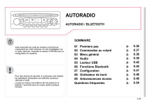 AUTORADIO AUTORADIO / BLUETOOTH SOMMAIRE Votre Autoradio est codé de manière à fonctionner uniquement sur votre véhicule. En cas d’installation sur un autre véhicule, consultez le réseau CITROËN pour la configuration du système. Pour des raisons de sécurité, le conducteur doit réaliser les opérations nécessitant une attention soutenue véhicule à l’arrêt. Lorsque le moteur est arrêté et afin de préserver la batterie, l’autoradio peut se couper après quelques minutes. 01 Premiers pas 02 Commandes au volant 03 Menu général 04 Audio 05 Lecteur USB 06 Fonctions Bluetooth 07 Configuration 08 Ordinateur de bord 09 Arborescences écrans Questions fréquentes p. p. p. p. p. p. p. p. p. p. 9.36 9.37 9.38 9.39 9.42 9.45 9.47 9.48 9.49 9.54 9.35 01 PREMIERS PAS 2 4 3 5 6 7 9 8 1 10 15 1. 2. 3. 4. 5. 6. 7. 9.36 Marche / Arrêt et réglage du volume. Ejection du CD. Sélection de l’affichage à l’écran entre les modes : Fonctions audio (AUDIO), Ordinateur de bord (TRIP) et Téléphone (TEL). Sélection de la source : radio, CD audio / CD MP3, USB, connexion Jack, Streaming. Sélection des gammes d’ondes FM1, FM2, FMast et AM. Réglage des options audio : balance avant / arrière, gauche / droite, loudness, ambiances sonores. Affichage de la liste des stations locales, des plages du CD ou des répertoires MP3. 8. 9. 14 13 Abandonner l’opération en cours. Marche / Arrêt de la fonction TA (Annonce Trafic). Appui long : accès au mode PTY (TYpes de Programmes radio). 10. Validation. 11. Recherche automatique fréquence inférieure / supérieure. Sélection plage CD, MP3 ou USB précédente / suivante. 12. Sélection fréquence radio inférieure / supérieure. Sélection répertoire MP3 précédent / suivant. Sélection répertoire / genre / artiste / playlist précédente / suivante de l’équipement USB. 11 12 13. Affichage du menu général. 14. Touches 1 à 6 : Sélection station de radio mémorisée. Appui long : mémorisation d’une station. 15. La touche DARK modifie l’affichage de l’écran pour un meilleur confort de conduite la nuit. 1er appui : éclairage du bandeau supérieur uniquement. 2ème appui : affichage d’un écran noir. 3ème appui : retour à l’affichage standard. ">