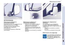 71 Rétroviseurs et vitres Rétroviseurs extérieurs à commande manuelle Manipulez le levier de réglage dans les quatre directions pour le régler. En stationnement, les rétroviseurs extérieurs sont rabattables manuellement. Il ne sont pas équipés du dégivrage automatique. Rétroviseurs extérieurs à commandes électriques - Placez la commande à droite ou à gauche pour sélectionner le rétroviseur correspondant. - Déplacez la commande dans les quatre directions pour effectuer le réglage. - Replacez la commande en position centrale. Rabattement / déploiement électrique Les rétroviseurs sont rabattables ou déployables électriquement de l’intérieur, véhicule en stationnement et contact mis : - Placez la commande en position centrale. - Tournez la commande vers le bas. Rétroviseurs avec dégivrage Les rétroviseurs associés aux réglages électriques peuvent être dégivrés. Appuyez sur la touche de dégivrage de la lunette arrière. ERGONOMIE et CONFORT RÉTROVISEURS 3 Rétroviseurs et vitres Fenêtres de télépéage / parking 72 Le pare-brise athermique comporte deux zones non réfléchissantes situées de chaque côté de la base du rétroviseur intérieur. Elles sont destinées à l’apposition des cartes de télépéage et/ou de parking. Rabattement forcé Rétroviseur intérieur manuel Si le boîtier du rétroviseur est sorti de son logement initial, véhicule à l’arrêt, repositionnez le manuellement ou utilisez la commande de rabattement électrique. Le rétroviseur intérieur possède deux positions : - jour (normal), - nuit (antiéblouissement). Pour passer de l’une à l’autre, poussez ou tirez le levier situé sur le bord inférieur du rétroviseur. ">
