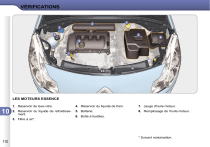 Vous trouverez ci-dessous de brèves informations sur C3 C3N Moteurs à essence. Ce guide illustre les principaux points de vérification d'un moteur à essence, notamment les réservoirs de lave-glace et de liquide de refroidissement, le filtre à air, le niveau d'huile moteur, la batterie et la boîte à fusibles. Il fournit des indications visuelles pour localiser ces composants et faciliter l'entretien du moteur.