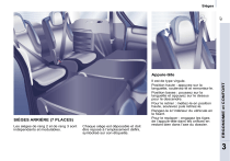67 Sièges SIÈGES ARRIÈRE (7 PLACES) Les sièges de rang 2 et de rang 3 sont indépendants et modulables. Chaque siège est déposable et doit être reposé à l’emplacement défini, symbolisé sur son étiquette. Il est de type virgule. Position haute : appuyez sur la languette, soulevez-le et remontez-le. Position basse : poussez sur la languette et appuyez sur le dessus pour le descendre. Pour le retirer : mettez-le en position haute, soulevez puis retirez-le. Rangez-le à l’intérieur du véhicule en le fixant. Pour le replacer : engagez les tiges de l’appuie-tête dans les orifices en restant bien dans l’axe du dossier. ERGONOMIE et CONFORT Appuie-tête 3 68 Sièges Les types de sièges Rang 2 Siège latéral gauche Siège central Les types de sièges Rang 3 Siège latéral gauche Siège latéral droit Siège latéral droit Sièges Modularité du siège Rang 2 Avant de rabattre le siège, veillez : - au rang 3, qu’aucun pied de passager ne se trouve à l’emplacement d’un ancrage du siège au plancher, - au bon verrouillage du siège au plancher, - à la disponibilité de la ceinture de sécurité pour le passager. Mettre le siège en position portefeuille - Passez à la position tablette. - Tirez la sangle rouge, située derrière le siège, pour dégager les pieds du siège de leur ancrage au plancher. - Basculez l’ensemble du siège vers l’avant. ERGONOMIE et CONFORT Remettre le siège en place - Rabattez l’ensemble du siège vers l’arrière. Incliner le dossier - Actionnez la commande et réglez l’inclinaison. Mettre le siège en position tablette - Abaissez l’appuie-tête au maximum. - Actionnez la commande pour rabattre le dossier sur l’assise du siège. 69 Remettre le dossier en place - Déverrouillez le dossier en tirant sur la commande, puis replacez-le dans sa position initiale. Vérifiez le bon ancrage de l’ensemble. 3 70 Sièges Modularité du siège Rang 3 Mettre le dossier en position tablette - Abaissez l’appuie-tête au maximum. - Actionnez la commande pour rabattre le dossier sur l’assise du siège. Remettre le dossier en place - Déverrouillez le dossier en tirant sur la commande, puis replacez-le dans sa position initiale. Vérifiez le bon ancrage de l’ensemble. Mettre le siège en position portefeuille - Passez à la position tablette. - Soulevez le palonnier équipé d’une sangle rouge, situé derrière le siège, pour dégager les pieds du siège de leur ancrage au plancher. - Basculez l’ensemble du siège vers l’avant. Remettre le siège en place - Poussez la commande rouge. - Rabattez l’ensemble du siège vers l’arrière. Veillez : - au bon verrouillage du siège au plancher, - à la disponibilité de la ceinture de sécurité pour le passager. Monter, descendre à partir du rang 3 Entrer - Placez le siège de rang 2 en position tablette. - Basculez-le en position portefeuille, afin de libérer le passage. Avant de le rabattre, vérifiez qu’en rang 3, les pieds du passager n’obstruent pas les points d’ancrage du siège de rang 2. - Tirez la sangle rouge pour mettre le siège en position portefeuille. Basculez l’ensemble vers l’avant. Sortir - Abaissez l’appuie-tête au maximum. - Actionnez la commande jaune, située au dos du dossier de rang 2. - Rabattre le dossier en position tablette. - Sortir par la porte latérale. Veillez au bon placement de la ceinture centrale rangée dans son renfoncement dans le garnissage du pavillon. ERGONOMIE et CONFORT 71 Sièges 3 72 Sièges Manipulation du siège Rang 2 Déposer le siège - Si c’est nécessaire, avancez les sièges avant. - Baissez l’appuie-tête. - Mettez le siège en position portefeuille. - Basculez l’ensemble vers l’avant puis soulevez-le. Reposer le siège L’étiquette du siège vous renseigne sur son emplacement à respecter. - Placez les crochets des pieds avant entre les deux barres. - Rabattez le siège vers l’arrière pour fixer les points d’ancrage arrière. - Actionnez la commande pour relever le dossier en position initiale. - Remontez l’appuie-tête. Veillez qu’aucun objet ou pieds, d’un passager assis à l’arrière, n’obstruent les alvéoles d’ancrage et n’empêchent le verrouillage correct de l’ensemble. Sièges Manipulation du siège Rang 3 Déposer le siège - Baissez l’appuie-tête. - Mettez le siège en position portefeuille. - Basculez l’ensemble vers l’avant. - Saisissez de chaque côté les montants du siège replié, en l’inclinant légèrement vers l’avant et soulevez-le. Reposer le siège L’étiquette du siège vous renseigne sur son emplacement à respecter. - Placez les crochets des pieds avant entre les deux barres. - Veillez qu’aucun objet ou pieds n’obstruent les alvéoles d’ancrage arrière et que la ceinture de sécurité soit bien positionnée et disponible. - Rabattez le siège vers l’arrière pour fixer ses pieds d’ancrage arrière. - Actionnez la commande pour relever le dossier en position initiale. - Remontez l’appuie-tête. Suite aux diverses manipulations : - ne pas déposer un appuie-tête sans le ranger, le fixer à un support dans le véhicule, - vérifier que les ceintures de sécurité restent toujours accessibles et faciles à boucler par le passager, - un passager ne doit pas s’installer sans ajuster et boucler sa ceinture de sécurité, - le passager assis en rang 3 doit veiller à ne pas obstruer les alvéoles d’ancrage du siège de rang 2. ERGONOMIE et CONFORT Ne déposez pas d’objets durs ou lourds sur les dossiers formant une tablette, ils pourraient devenir des projectiles dangereux en cas de freinage brusque ou de choc. 73 Du bon usage 3 ">