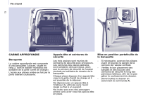 72 Vie à bord CABINE APPROFONDIE Banquette La cabine approfondie est composée d’une banquette 3 places, située en rang 2, dont le dossier monobloc est solidaire de la grille «arrêt de charge». L’accès aux places arrière se fait par la porte latérale coulissante. Appuie-tête et ceintures de sécurité Mise en position portefeuille de la banquette Les trois assises sont munies de ceintures de sécurité avec enrouleurs. Les ceintures des places latérales sont solidaires des panneaux, alors que la ceinture de sécurité de l’assise centrale est solidaire du dossier de la banquette. Chaque place dispose d’un appuie-tête vissé à la grille d’arrêt de charge et il est possible de le déposer. Ne déposez pas un appuie-tête à l’intérieur du véhicule sans l’avoir rangé ou fixé à un support. Ne roulez pas avec des passagers arrière sans avoir vissé les appuie-tête en place. - - Si nécessaire, avancez les sièges avant et bouclez la sangle de la ceinture de l’assise centrale. Vérifiez le bon placement des sangles et des boucles des ceintures de sécurité le long des panneaux latéraux, afin de ne pas gêner le coulissement du dossier. Déverrouillez le dossier en actionnant la commande A. Vie à bord Il est inutile d’aider, d’accompagner ou de retenir par le bras resté libre pendant le mouvement de basculement. Les armatures des ceintures de sécurité arrière ne sont pas conçues pour arrimer le chargement transporté. N’utilisez que les anneaux d’arrimage au plancher. La banquette de la cabine approfondie n’est pas adaptée à l’installation d’un siège enfant. A l’aide de la même main, rabattez le dossier et la grille associée sur l’assise. Remise en position assise de la banquette - - Saisissez la sangle rouge (comme une poignée) et levez verticalement l’ensemble en accompagnant le mouvement jusqu’en position portefeuille. L’assise relevée s’appuie sur les dossiers des sièges du rang 1. D’un seul mouvement : saisissez la sangle rouge et tirez horizontalement l’ensemble vers l’arrière. Accompagnez le mouvement jusqu’au verrouillage des pieds de la banquette au plancher. - Relevez le dossier. La commande A se verrouille automatiquement. - Vérifiez le bon verrouillage au plancher de la banquette revenue en position assise. Ne laissez pas retomber l’ensemble brutalement. ERGONOMIE et CONFORT - 73 Du bon usage 3 ">