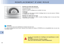REMPLACEMENT D'UNE ROUE Accès à la roue de secours Pour accéder à la roue de secours Soulevez le tapis. Retirez la boîte d’outillage pour accéder à la roue. Outillage L'outillage est situé dans la boîte d’outillage dans la roue de secours. Retirez la sangle pour y accéder. Remise en place de la roue Remettez la roue dans le coffre, la boîte d'outillage dans la roue puis fixez l'ensemble par la sangle. Conseil Les vis de roues sont spécifiques à chaque type de roue. En cas de changement des roues, assurez-vous auprès du réseau CITROËN de la compatibilité des vis avec les nouvelles roues. V Le cric et l’ensemble de l’outillage sont spécifiques à votre véhicule. Ne l'utilisez pas pour d'autres usages. Avec une roue de secours, rouler prudemment. 84 REMPLACEMENT D'UNE ROUE Démontage 1. Immobilisez le véhicule sur un sol horizontal stable et non glissant. Serrez le frein de stationnement. Coupez le contact et engagez la première vitesse ou la marche arrière suivant la pente. Assurez-vous impérativement que les occupants sont sortis du véhicule et situés dans une zone garantissant leur sécurité. 2. Positionnez le cric à l'un des quatre emplacements prévus sur le soubassement à proximité des roues et développez-le jusqu'au sol à l'aide de la manivelle. 3. Pour décliper l'enjoliveur, tirez à l'aide de l'extrémité de la clé démonteroue par un des orifices de l'enjoliveur. 4. Développez à nouveau le cric jusqu’à ce que la roue soit à quelques centimètres du sol. 5. Dévissez les autres vis, déposez la roue. Outillage 1. Cric 2. Clé démonte-roue 3. Anneau amovible de remorquage. 3 1 V 2 85 REMPLACEMENT D'UNE ROUE Remontage 1. Engagez la roue sur le moyeu. 2. Serrez les vis sans les bloquer. 3. Rétractez le cric et dégagez-le. 4. Bloquez les vis de roue à l’aide de la clé démonte-roue. 5. Replacez l'enjoliveur en prenant soin de l'orienter par rapport à la valve de la roue. Puis clipez l'enjoliveur en appuyant sur son pourtour. 6. Remontez la roue d’origine réparée dès que possible. 7. Rétablissez la pression de gonflage de celle-ci (voir «Identification» et «Précautions d'utilisation») et faites vérifier l'équilibrage. Dimension de la roue de secours Si votre roue de secours est d'une dimension différente de celles équipant votre véhicule (identifiée par une étiquette), il est impératif de l'utiliser temporairement, de rouler prudemment, de ne pas dépasser 80 km/h et de la remplacer dès que possible. Pression des pneumatiques Celle-ci est indiquée sur l'étiquette positionnée à l'intérieur de la porte avant gauche. Voir «Identification» et «Précautions d’utilisation». V Ne vous engagez jamais sous le véhicule lorsque celui-ci est simplement soulevé par le cric. Lors du remplacement d'une roue, il est préconisé d'immobiliser le véhicule sur un sol plan et stable. 86 ">