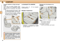 3 CONFORT Position tablette du siège passager avant Cette mise en position tablette, associée à celle de la banquette arrière, vous permet de transporter des objets longs. Poussez la commande vers le haut et accompagnez-le dossier vers l’avant pour le rabattre sur l’assise. Pour la remise en place, relevez le dossier et accompagnez-le vers l’arrière jusqu’à son blocage. LA BANQUETTE ARRIÈRE Chaque partie 1/3 - 2/3 est réglable individuellement. Réglage longitudinal Soulevez la commande et faites coulisser la banquette vers l’avant ou vers l’arrière. ! 48 N’oubliez pas de rabattre au préalable la tablette type «aviation» fixée au dos du siège. Par sécurité, un passager assis à l’arrière du véhicule ne doit pas poser ses pieds sur le siège avant mis en position tablette. Réglage de l’inclinaison du dossier Deux positions de réglage sont disponibles : - une position standard, - une position inclinée. Pour régler le dossier : Tirez la commande vers l’avant. CONFORT Réglage des appuis-tête Position escamotable Flaps derrière la banquette La banquette arrière 1/3 - 2/3 est équipée d’appuis-tête virgule. Ils ont une position haute (confort et sécurité) et une position basse (visibilité arrière). Ils sont également démontables ; pour les enlever : tirez-le vers le haut jusqu’en butée, puis, appuyez sur l’ergot A. Avancez le siège avant correspondant si nécessaire. Placez les appuis-tête en position basse. Tirez la commande A, pour déverrouiller le dossier qui bascule aisément sur l’assise. Cette manoeuvre s’accompagne d’un recul automatique de l’assise. La banquette s’insère dans le plancher et offre un plancher plat et continu. Pour remettre le dossier en place : Basculez le dossier vers l’arrière jusqu’au verrouillage. Replacez l’assise dans la position souhaitée. Des flaps B fixés au dos de la banquette assurent la fermeture du fond du coffre lorsque la banquette est avancée. Tirez sur la partie supérieure des flaps pour les débloquer. Ils assurent alors la continuité du plancher plat. i Lorsque des passagers sont installés à l’arrière, ne roulez jamais avec les appuis-tête déposés. Ceux-ci doivent être en place et en position haute. i Lors de la remise en place, veillez à ne pas coincer les ceintures de sécurité. i 3 Veillez à ce qu’ils soient correctement fixés au dossier avant toute manipulation. La fixation de chaque flap sur l’arrière du siège est réalisée par deux clips démontables en plastique. Pour désolidariser les flaps de l’arrière du dossier, appuyez fortement sur la partie supérieure des deux clips plastiques, vers le bas, pour les libérer. Pour éviter tout risque de casse, ils se décrochent en cas de sollicitation excessive. 49 ">