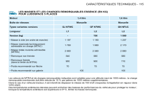 CARACTÉRISTIQUES TECHNIQUES - 115 LES MASSES ET LES CHARGES REMORQUABLES ESSENCE (EN KG) POUR LUDOSPACE 5 PLACES Moteur Boîte de vitesses Types variantes versions 1,4 litre 1,6 litre Manuelle Manuelle GJ KFWC GF KFWC GN NFUC L1 L2 L2 - 750 1 000 • Masse à vide (en ordre de marche) 1 197 1 190 1 207 • Masse maximale techniquement admissible en charge (MTAC) 1 780 1 680 2 170 • Masse totale roulante admissible (MTRA) 2 680 2 580 2 880 • Remorque non freinée 540 585 585 • Remorque freinée (dans la limite du MTRA) 900 900 710 70 75 75 Longueur Version (kg) • Poids recommandé sur flèche • Poids recommandé sur galerie 100 100 Les valeurs de MTRA et de charges remorquables indiquées sont valables pour une altitude maxi de 1000 mètres ; la charge remorquable mentionnée doit être réduite de 10 % par paliers de 1000 mètres supplémentaires. Dans le cas d’un véhicule tracteur, il est interdit de dépasser la vitesse de 100 km/h (respectez la législation en vigueur dans votre pays). Des températures extérieures élevées peuvent entraîner des baisses de performances du véhicule pour protéger le moteur ; lorsque la température extérieure est supérieure à 37°C, limiter la masse remorquée. 116 - CARACTÉRISTIQUES TECHNIQUES LES MASSES ET LES CHARGES REMORQUABLES ESSENCE (EN KG) POUR LUDOSPACE 7 PLACES Moteur 1,4 litre Boîte de vitesses Types variantes versions Manuelle GG KFWC Longueur Version (kg) 1,6 litre GK NJUC L2 750 1 000 • Masse à vide (en ordre de marche) 1 207 1 232 • Masse maximale techniquement admissible en charge (MTAC) 1 845 2 190 • Masse totale roulante admissible (MTRA) 2 645 2 880 • Remorque non freinée 585 585 • Remorque freinée (dans la limite du MTRA) 800 690 • Poids recommandé sur flèche 75 75 • Poids recommandé sur galerie 100 100 Les valeurs de MTRA et de charges remorquables indiquées sont valables pour une altitude maxi de 1000 mètres ; la charge remorquable mentionnée doit être réduite de 10 % par paliers de 1000 mètres supplémentaires. Dans le cas d’un véhicule tracteur, il est interdit de dépasser la vitesse de 100 km/h (respectez la législation en vigueur dans votre pays). Des températures extérieures élevées peuvent entraîner des baisses de performances du véhicule pour protéger le moteur ; lorsque la température extérieure est supérieure à 37°C, limiter la masse remorquée. ">