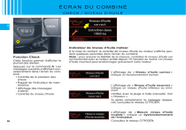 ÉCRAN DU COMBINÉ CHECK / NIVEAU D'HUILE II A Indicateur de niveau d’huile moteur Fonction Check Cette fonction permet d’afficher le journal des alertes. Appuyez sur la commande A. Les messages suivants s’affichent successivement dans l’écran du combiné : • Contrôle de la pression des pneus. • Rappel de l’indicateur de maintenance. • Affichage des messages d’alerte. • Contrôle du niveau d’huile. 38 À la mise du contact, le contrôle de niveau d'huile du moteur s’affiche pendant quelques secondes dans l’écran du combiné. Nota : pour assurer la fiabilité de la mesure, contrôlez le niveau d’huile sur sol horizontal avec le moteur arrêté depuis 15 minutes au moins. Un niveau d’huile incorrect peut endommager gravement votre moteur. L'affichage de « Niveau d’huile correct » indique un fonctionnement normal. L'affichage de « Niveau d’huile incorrect » indique un niveau d'huile inférieur au minimum. Vérifiez avec la jauge à huile manuelle. Voir « Niveaux ». Si après complément, le message réapparaît, consultez le réseau CITROËN. L'affichage de « Mesure niveau d’huile invalide » indique un dysfonctionnement de l'indicateur. Consultez le réseau CITROËN. ">