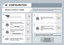 08 CONFIGURATION RÉGLER LA DATE ET L’HEURE 1 Cette fonction donne accès aux options : Langues, Date et heure, Affichage (Luminosité, Harmonie de couleur, Couleur carte), Paramètres véhicule, Unités, Paramètres système. 5 Appuyer sur la touche SET UP. 2 Sélectionner la fonction «Date et heure» et appuyer sur la molette pour valider. DATE ET HEURE 3 Sélectionner la fonction «Régler date et heure» et appuyer sur la molette pour valider. RÉGLER DATE ET HEURE 4 Régler les paramètres à l’aide des flèches directionnelles un par un en validant avec la molette. Sélectionner la fonction «Format date» et appuyer sur la molette pour valider. 6 Valider le format souhaité à l’aide de la molette. Sélectionner la fonction «Format heure» et appuyer sur la molette pour valider. Valider le format souhaité à l’aide de la molette. Appuyer plus de 2 secondes sur la touche SET UP permet d’accéder à: DÉTAILS D’APPAREIL COUVERTURE GPS MODE DÉMONSTRATION 9.40 ORDINATEUR DE BORD / PARAMÈTRES VÉHICULE ORDINATEUR DE BORD Appuyer sur la touche MAIN ou appuyer successivement sur la touche MODE jusqu’à l’affichage de l’ordinateur de bord. - L’onglet «véhicule» : L’autonomie, la consommation instantanée et la distance restant à parcourir. - L’onglet «1» (parcours 1) avec : La vitesse moyenne, la consommation moyenne et la distance parcourue calculées sur le parcours «1». - L’onglet «2» (parcours 2) avec les mêmes caractéristiques pour un second parcours. QUELQUES DÉFINITIONS Autonomie : affiche le nombre de kilomètres pouvant être parcourus avec le reste de carburant détecté dans le réservoir, en fonction de la consommation moyenne des derniers kilomètres parcourus. Cette valeur affichée peut fortement varier à la suite d’un changement d’allure du véhicule ou du relief du parcours. Dès que l’autonomie est inférieure à 30 km, des tirets s’affichent. Après un complément de carburant d’au moins 5 litres, l’autonomie est recalculée et s’affiche dès qu’elle dépasse 100 km. Si des tirets s’affichent durablement en roulant à la place des chiffres, consultez le réseau CITROËN. Consommation instantanée : calculée et affichée qu’à partir de 30 km/h. Consommation moyenne : c’est la quantité moyenne de carburant consommée depuis la dernière remise à zéro de l’ordinateur. Distance parcourue : calculée à partir de la dernière remise à zéro de l’ordinateur de bord. Chaque pression sur le bouton, situé à l’extrémité de la commande d’essuie-vitre, permet d’afficher successivement les différentes données de l’ordinateur de bord, en fonction de l’écran. Distance restant à parcourir : calculée en référence à la destination finale, saisie par l’utilisateur. Si un guidage est activé, le système de navigation la calcule en instantané. Vitesse moyenne : c’est la vitesse moyenne calculée depuis la dernière remise à zéro de l’ordinateur (contact mis). 9.41 ">