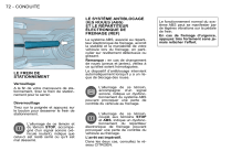 72 - CONDUITE LE SYSTÈME ANTIBLOCAGE DES ROUES (ABS) ET LE RÉPARTITEUR ÉLECTRONIQUE DE FREINAGE (REF) LE FREIN DE STATIONNEMENT Verrouillage A la fin de votre manoeuvre de stationnement, tirez le frein de stationnement pour le serrer. Déverrouillage Tirez sur la poignée et appuyez sur le bouton pour desserrer le frein de stationnement. L’allumage de ce témoin et du témoin STOP, accompagné d’un signal sonore (véhicule roulant), indique que celui-ci est resté serré ou qu’il est mal desserré. Le système ABS, associé au répartiteur électronique de freinage, accroît la stabilité et la maniabilité de votre véhicule lors du freinage, en particulier sur revêtement défectueux ou glissant. Remarque : en cas de changement de roues (pneus et jantes), veillez à ce qu’elles soient homologuées. Le dispositif d’antiblocage intervient automatiquement lorsqu’il y a un risque de blocage des roues. L’allumage de ce témoin, accompagné d’un signal sonore, indique un dysfonctionnement du système ABS pouvant provoquer une perte de contrôle du véhicule au freinage. L’allumage de ce témoin, couplé aux témoins STOP et ABS, indique un dysfonctionnement du répartiteur électronique de freinage pouvant provoquer une perte de contrôle du véhicule au freinage. L’arrêt est impératif. Dans les deux cas, consultez le réseau CITROËN. Le fonctionnement normal du système ABS peut se manifester par de légères vibrations sur la pédale de frein. En cas de freinage d’urgence, appuyez très fortement sans jamais relâcher l’effort. ">