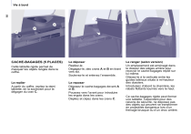 88 Vie à bord CACHE-BAGAGES (5 PLACES) Cette tablette rigide permet de masquer les objets rangés dans le coffre. Le replier A partir du coffre, repliez la demi tablette, en la soulevant pour la dégager du cran C. Le déposer Repliez-le. Dégagez-le, des crans A et B en tirant vers soi. Soulevez-le et enlevez l’ensemble. Le reposer Déposez le cache-bagages devant A et B. Poussez vers l’avant pour introduire les ergots dans les crans. Dépliez et clipez dans les crans C. Le ranger (selon version) Un emplacement est aménagé dans le dossier des sièges arrière pour recevoir le cache-bagages replié sur lui-même. Glissez-le à la verticale entre les guides latéraux situés à mi-hauteur des dossiers. Introduisez d’abord la charnière, les rabats flottants tournés vers le haut. Ce cache-bagages rigide peut former une tablette. Cependant pour des raisons de sécurité, ne déposez pas des objets qui peuvent se transformer en projectiles dangereux lors d’un freinage brusque ou d’un choc arrière. ">