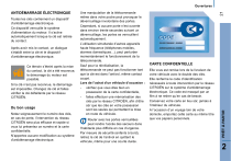 Toutes les clés contiennent un dispositif d’antidémarrage électronique. Ce dispositif verrouille le système d’alimentation du moteur. Il s’active automatiquement lorsque la clé est retirée du contact. Après avoir mis le contact, un dialogue s’établit entre la clé et le dispositif d’antidémarrage électronique. Ce témoin s’éteint après la mise du contact, la clé a été reconnue, le démarrage du moteur est possible. Si la clé n’est pas reconnue, le démarrage est impossible. Changez de clé et faites vérifier la clé défaillante par le réseau CITROËN. Du bon usage Notez soigneusement le numéro des clés, en cas de perte, l’intervention du réseau CITROËN sera plus efficace et rapide si vous lui présentez ce numéro et la carte confidentielle. N’apportez aucune modification au système d’antidémarrage électronique. Une manipulation de la télécommande même dans votre poche peut provoquer le déverrouillage involontaire des portes. Cependant, si aucune porte n’est ouverte dans environ trente secondes suivant un déverrouillage, les portes se verrouillent automatiquement. L’utilisation simultanée d’autres appareils haute fréquence (téléphones mobiles, alarmes domestiques...), peut perturber momentanément le fonctionnement de la télécommande. Sauf pour la réinitialisation, la télécommande ne peut pas fonctionner tant que la clé est dans l’antivol, même contact coupé. Lors de l’achat d’un véhicule d’occasion : vérifiez que vous êtes bien en possession de la carte confidentielle, faites effectuer une mémorisation des clés par le réseau CITROËN, afin d’être sûr que les clés en votre possession sont les seules qui permettent la mise en route du véhicule. Rouler avec les portes verrouillées peut rendre l’accès des secours dans l’habitacle plus difficile en cas d’urgence. Par mesure de sécurité (enfants à bord), retirez la clé de l’antivol en quittant le véhicule, même pour une courte durée. CARTE CONFIDENTIELLE Elle vous est remise lors de la livraison de votre véhicule avec le double des clés. Elle renferme le code d’identification nécessaire à toute intervention par le réseau CITROËN sur le système d’antidémarrage électronique. Ce code est masqué par un film à ne retirer qu’en cas de besoin. Conservez votre carte en lieu sûr, jamais à l’intérieur du véhicule. A l’occasion d’un voyage loin de votre domicile, emportez cette carte au même titre que vos papiers personnels. PRÊT À PARTIR ANTIDÉMARRAGE ÉLECTRONIQUE 21 Ouvertures 2 ">