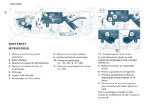 96 Sous capot SOUS CAPOT MOTEURS DIESEL 1 - Réservoir de lave-vitre et laveprojecteurs. 2 - Boîte à fusibles. 3 - Réservoir du liquide de refroidissement. 4 - Réservoir du liquide de freins et d’embrayage. 5 - Filtre à air. 6 - Jauge à huile manuelle. 7 - Remplissage de l’huile moteur. 8 - Réservoir de direction assistée. 9 - Anneau amovible de remorquage. 10 - Pompe de réamorçage (a : 1,6 L HDi ; b : 2 L HDi). 11 - Entonnoir remplissage huile moteur (2 L HDi). 7.1 - Remplissage de l’huile moteur. Si votre véhicule est équipé de cette goulotte de remplissage d’huile, procéder comme suit : A - Retirez le bouchon de remplissage d’huile. B - Retirez la goulotte de son logement. C - Placez la goulotte dans l’orifice de remplissage comme présenté sur le dessin. D - Tournez d’1/4 de tour vers la gauche pour verrouiller puis faîtes l’appoint en huile. Pour le remontage, procédez en sens inverse en n’oubliant pas de bien revisser le bouchon A. ">