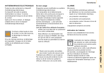 ANTIDÉMARRAGE ÉLECTRONIQUE Du bon usage ALARME Toutes les clés contiennent un dispositif d’antidémarrage électronique. Ce dispositif verrouille le système d’alimentation du moteur. Il s’active automatiquement lorsque la clé est retirée du contact. Après avoir mis le contact, un dialogue s’établit entre la clé et le dispositif d’antidémarrage électronique. N’apportez aucune modification au système d’antidémarrage électronique. Une manipulation de la télécommande même dans votre poche peut provoquer le déverrouillage involontaire des portes. L’utilisation simultanée d’autres appareils haute fréquence (téléphones mobiles, alarmes domestiques...), peut perturber momentanément le fonctionnement de la télécommande. Lors de l’achat d’un véhicule d’occasion : - vérifiez que vous êtes bien en possession de la carte confidentielle, Elle assure : - une protection périmétrique extérieure par détecteurs sur les ouvertures (portes, capot) et sur l’alimentation électrique, - faites effectuer une mémorisation des clés par le réseau CITROËN, afin d’être sûr que les clés en votre possession sont les seules qui permettent la mise en route du véhicule. Rouler avec les portes verrouillées peut rendre l’accès des secours dans l’habitacle plus difficile en cas d’urgence. Par mesure de sécurité (enfants à bord), retirez la clé de l’antivol en quittant le véhicule, même pour une courte durée. une protection volumétrique, - une protection anti-soulèvement, - une protection contre l’intrusion d’une clé dans le démarreur. L’équipement comprend une sirène. Activation de l’alarme Assurez-vous préalablement de la bonne fermeture de tous les ouvrants. L’activation de l’alarme s’effectue par pression sur cette commande, les protections sont actives après quelques secondes. Quand l’alarme est en veille, toute effraction déclenche la sirène pendant environ 30 secondes, accompagnée de l’allumage des feux indicateurs de direction. L’alarme repasse ensuite en veille. L’alarme se déclenche également après une coupure de l’alimentation électrique, à son rétablissement. PRÊT à PARTIR Ce témoin s’éteint après la mise du contact, la clé a été reconnue, le démarrage du moteur est possible. Si la clé n’est pas reconnue, le démarrage est impossible. Changez de clé et faites vérifier la clé défaillante par le réseau CITROËN. - 31 Ouvertures 1 ">