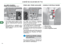 AMÉNAGEMENTS 6 ALLUME-CIGARES / PRISE ACCESSOIRES 12 V PRISE USB / PRISE AUXILIAIRE CONSOLE CENTRALE BASSE Pour utiliser l’allume-cigares, enfoncez-le et attendez quelques secondes son déclenchement automatique. Pour brancher un accessoire 12 V (puissance maxi : 120 W), retirez l’allume-cigares et branchez l’adaptateur adéquat. Ce boîtier de connexion, composé d’une prise JACK et d’un port USB, est situé sur la console centrale. Il vous permet de brancher un équipement nomade, tel qu’un baladeur numérique de type iPod® ou une clé USB. Il lit certains formats de fichiers audio et permet leur écoute via les haut-parleurs du véhicule. Vous pouvez gérer ces fichiers avec les commandes au volant ou la façade de l’autoradio et les visualiser sur l’écran multifonction. 1. Vide-poches 2. Porte-canettes 3. Grand rangement ouvert Pendant son utilisation, l’équipement nomade peut se recharger automatiquement. Pour plus de détails sur l’utilisation de cet équipement, reportez-vous au chapitre «Audio et Télématique». 112 AMÉNAGEMENTS CONSOLE CENTRALE SEMI-HAUTE 1. Accoudoir avant (voir détails en pages suivantes) 2. Rangements ouverts 3. Porte-canettes 4. Vide-poches 6 CONSOLE CENTRALE HAUTE 1. Accoudoir avant (voir détails en pages suivantes) 2. Prise accessoires 12 V (voir détails en pages suivantes) 3. Boîte de rangement 4. Porte-canette / Porte-bouteille 5. Vide-poches 6. Grand rangement multifonctionnel (voir détails en pages suivantes) 113 ">