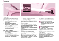 22 Ouvertures GIRAFON Ce volet arrière de pavillon de toit n’est compatible qu’avec les portes battantes. Pour ouvrir le girafon : - relevez la palette noire de la genouillère, - soulagez la genouillère en appuyant sur le girafon (vers le bas) puis dégagez le crochet, - soulevez le girafon, - dépassez le point de résistance pour bloquer le girafon avec les béquilles de maintien. Pour fermer le girafon : - vérifiez le bon verrouillage de la barre d’appui, - abaissez le girafon, - tout en appuyant sur le girafon (vers le bas), prenez les deux boucles du ressort puis placez le crochet dans son logement, - abaissez la palette noire pour verrouiller le girafon. Le verrouillage du girafon permet un bon placage sur le joint et garantit une étanchéité avec une absence de bruit. Barre d’appui Vous disposez d’une barre d’appui pour transporter des charges longues, après ouverture du girafon. Rabattez la barre d’appui en soulevant le levier. Accompagnez-la jusqu’au montant de porte. Maintenez les charges longues à transporter, soulevez-les et repositionnez la barre d’appui d’une seule main. Assurez-vous du bon verrouillage en appuyant sur la poignée vers le bas jusqu’à passer le point dur et attachez solidement les charges. Les supports latéraux peuvent être utilisés comme points d’accrochage. Le pare-chocs arrière a été renforcé pour servir de marchepied, lors de l’accès dans le véhicule. Ne roulez jamais sans la barre d’appui en place. Les portes arrière se verrouillent uniquement avec la barre d’appui installée. Lorsque le girafon est ouvert, faites attention dans les passages avec une hauteur limitée. N’appuyez jamais de charges directement sur les portes arrière. Respectez les codifications d’usage, pour attirer l’attention des autres conducteurs. ">