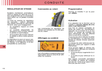 CONDUITE RÉGULATEUR DE VITESSE Système maintenant automatiquement la vitesse du véhicule à la valeur programmée par le conducteur, sans action sur la pédale d’accélérateur. La mise en marche du régulateur est manuelle : celle-ci nécessite une vitesse minimale du véhicule de 40 km/h, ainsi que l’engagement : - du quatrième rapport en boîte manuelle, - en conduite séquentielle, du deuxième avec la boîte manuelle pilotée ou automatique, - de la position A en boîte manuelle pilotée ou D en boîte automatique. Le régulateur ne peut, en aucun cas, remplacer le respect des limitations de vitesse, ni la vigilance, ni la responsabilité du conducteur. Commandes au volant Tournez la molette 1 sur la position «REG». Activation Les commandes du régulateur de vitesse sont situées sur le côté gauche du volant. Affichages au combiné IX Les informations programmées sont regroupées dans la zone A de l’afficheur du combiné. 118 Programmation À la sélection de la fonction par la molette 1, aucune vitesse de croisière n’est mémorisée. Une fois la vitesse souhaitée atteinte par action sur l’accélérateur, appuyez sur la touche 2 ou la touche 4. La vitesse de croisière est alors mémorisée. Elle est affichée dans la zone A du combiné. Vous pouvez alors relâcher la pédale d’accélérateur. Le véhicule maintiendra la vitesse choisie automatiquement. La vitesse de votre véhicule peut légèrement varier par rapport à celle mémorisée. Vous pouvez régler la vitesse mémorisée dans l’afficheur du combiné en appuyant sur : la touche 4 pour augmenter la vitesse, la touche 2 pour diminuer la vitesse. Des appuis successifs permettent de modifier la vitesse de croisière par pas de 1 km/h et un appui maintenu par pas de 5 km/h. CONDUITE Neutralisation Soit par appui sur la pédale de frein ou la pédale d’embrayage. Soit en appuyant sur la touche 3. Soit lorsque l’un des systèmes ESP ou ASR agit. Le régulateur de vitesse est désactivé si le levier de vitesse est au point mort ou en position neutre. Ces actions font apparaître l’information «OFF» de l’afficheur du combiné. Ces manœuvres n’annulent pas la vitesse de croisière qui reste affichée au combiné. Réactivation Par rappel de la vitesse mémorisée Après neutralisation, appuyez sur la touche 3. Votre véhicule reprend automatiquement la vitesse de croisière mémorisée et affichée dans la zone A. Si la vitesse de croisière mémorisée est plus élevée que la vitesse courante, le véhicule accélérera fortement pour atteindre celle-ci. Par sélection de la vitesse en cours Appuyez sur la touche 2 ou 4, une fois la vitesse souhaitée atteinte. L’information «OFF» disparaît alors de l’afficheur du combiné. Dépassement de la vitesse programmée En cours de régulation, il est toujours possible, par action sur la pédale d’accélérateur d’aller au-delà de la vitesse de croisière (dépassement d’un autre véhicule par exemple). La vitesse affichée dans la zone A clignote. Il suffit ensuite de relâcher la pédale d’accélérateur pour revenir à la vitesse de croisière. Si en cours de régulation le système est dans l’impossibilité de maintenir la vitesse de croisière (forte descente), alors la vitesse clignote. Si nécessaire, adaptez votre allure. Retour à la conduite normale Par action sur la molette 1 de la position «REG» vers la position 0. Par arrêt du moteur. La vitesse de croisière choisie précédemment n’est plus mémorisée. Anomalie de fonctionnement En cas de dysfonctionnement, un message s’affiche accompagné d’un signal sonore et de l’allumage du témoin de service. Faites vérifier par le réseau CITROËN. Le régulateur de vitesse ne doit être utilisé que lorsque les conditions de roulage à vitesse constante le permettent. Ne l’utilisez pas lorsque la circulation est très dense, sur route accidentée, présentant de mauvaises conditions d’adhérence ou toute autre difficulté. Le conducteur doit rester attentif et conserver une parfaite maîtrise de son véhicule. Il est recommandé de laisser ses pieds à proximité des pédales. Pour éviter tout risque de blocage des pédales : - veillez au bon positionnement du surtapis, - ne superposez jamais plusieurs surtapis. IX 119 ">