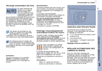 Si votre véhicule est équipé d’un capteur de luminosité, les feux de position et de croisement s’allument automatiquement en cas de faible luminosité ainsi qu’en cas de fonctionnement des essuie-vitres. Ils s’éteignent dès que la luminosité est redevenue suffisante ou que les essuie-vitres sont arrêtés. Cette fonction n’est pas compatible avec les feux diurnes. Par temps de brouillard ou de neige, le capteur de luminosité peut détecter une lumière suffisante. Par conséquent, les feux ne s’allumeront pas automatiquement. Ne masquez pas le capteur de luminosité situé sur la planche de bord, au centre. Il sert à l’allumage automatique des feux et à l’essuyage automatique. Activation Tournez la bague sur la position AUTO. La fonction activée est accompagnée d’un message sur l’écran. Neutralisation Tournez la bague soit vers l’avant, soit vers l’arrière. La fonction neutralisée est accompagnée d’un message sur l’écran. La fonction est neutralisée temporairement quand vous utilisez la commande manuelle d’éclairage. En cas de dysfonctionnement du capteur de luminosité, les feux s’allument accompagnés du témoin de service, d’un signal sonore et d’un message sur l’écran. Consultez le réseau CITROËN. Eclairage d’accompagnement automatique (Follow me home) Contact coupé, lorsque vous quittez votre véhicule avec l’allumage automatique des feux activé, les feux de position et de croisement restent allumés pendant la durée sélectionnée. Pour neutraliser ou activer cette fonction, passez par le menu de configuration de l’écran. La durée de temporisation est également à régler (15, 30, 60 s), via le menu de configuration de l’écran. Effectuez ces opérations véhicule à l’arrêt. Annulation : - faites un «appel de phares», - sortez et verrouillez le véhicule. FAISCEAU DES PROJECTEURS En fonction de la charge de votre véhicule, il est nécessaire de corriger le réglage du faisceau. 0 - 1 ou 2 personnes aux places avant. 1 - 5 personnes. 2 - 6 à 8 personnes. 3 - Conducteur + charges maximales autorisées. Réglage initial en position 0. RÉGLAGE AUTOMATIQUE DES LAMPES AU XENON Pour les véhicules équipés de lampes au xénon, ce système corrige automatiquement la hauteur du faisceau, quel que soit l’état de charge du véhicule. Le conducteur est alors assuré d’avoir un éclairage optimal et de ne procurer aucune gêne aux autres usagers de la route. ERGONOMIE et CONFORT Allumage automatique des feux 45 Commandes au volant 3 ">