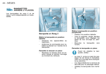 44 - SIÈGES BANQUETTES ARRIÈRE (7 PLACES) Les banquettes de rang 2 et de rang 3 sont indépendantes et modulables. Banquette en Rang 2 Mettre la banquette en position tablette - Abaissez les appuie-têtes au maximum. - Actionnez la commande pour rabattre le dossier sur l’assise de la banquette. Remettre le dossier en place - Replacez le dossier dans sa position initiale et vérifiez l’ancrage au montant du véhicule. Mettre la banquette en position portefeuille - Passez à la position tablette. - Tirez la poignée, située derrière la banquette, pour dégager les pieds de leur ancrage au plancher. - Basculez la banquette vers l’avant. Remettre la banquette en place Avant de rabattre la banquette, veillez : - - au rang 3, qu’aucun pied de passager ne se trouve à l’emplacement d’un ancrage de la banquette au plancher, à la disponibilité de la ceinture de sécurité pour le passager latéral, rabattez la banquette vers l’arrière. SIÈGES - 45 Accès au rang 3 Depuis la porte coulissante droite du véhicule, un passage à côté de la banquette du rang 2 donne accès à la banquette du rang 3. Du bon usage Mettre la banquette en position portefeuille - Passez à la position tablette. - Soulevez la poignée, située derrière la banquette, pour dégager les pieds de leur ancrage au plancher. - Basculez la banquette vers l’avant. Banquette en Rang 3 Mettre le dossier en position tablette - Abaissez les appuie-têtes au maximum. - Actionnez simultanément les deux commandes pour rabattre le dossier sur l’assise de la banquette. Remettre le dossier en place - Replacez le dossier dans sa position initiale et vérifiez les ancrages aux montants du véhicule. Remettre la banquette en place - Avant de rabattre la banquette, veillez à la disponibilité de la ceinture de sécurité pour les passagers latéraux. - Rabattez la banquette vers l’arrière. Ne déposez pas d’objets durs ou lourds sur les dossiers formant une tablette, ils pourraient devenir des projectiles dangereux en cas de freinage brusque ou de choc. Suite aux diverses manipulations : - ne pas déposer un appuie-tête sans le ranger, le fixer à un support dans le véhicule, - ne pas obstruer le passage au rang 3, - vérifier que les ceintures de sécurité restent toujours accessibles et faciles à boucler par le passager, - un passager ne doit pas s’installer sans ajuster et boucler sa ceinture de sécurité, - le passager assis en rang 3 doit veiller à ne pas obstruer les alvéoles d’ancrage de la banquette de rang 2. ">